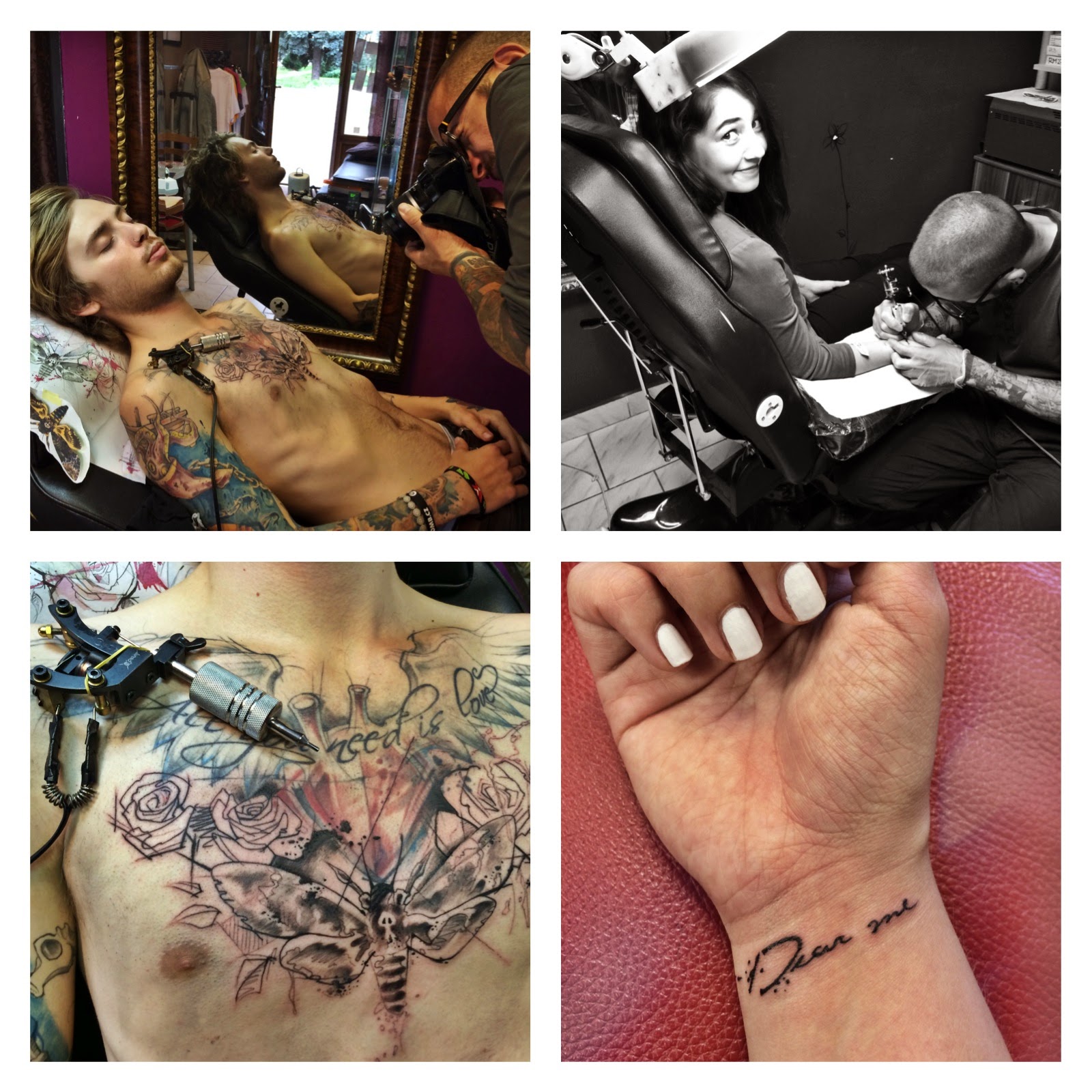 V našem milovaném tetovacím studiu v Kyjově. Doporučuju stoprocentně, skvělý přístup, příjemná atmosféra a nádherné kresby. Sice to mám naprosto z ruky, ale ráda tam jedu i když je zrovna objednanej jen Dára. Občas se totiž stane, že si vymyslím nějakou maličkost a zrovna je na ní čas. Tentokrát jsme po Dárově rozšiřování hrudníku stihli ještě společnou kérku k našemu výročí, Dear me.