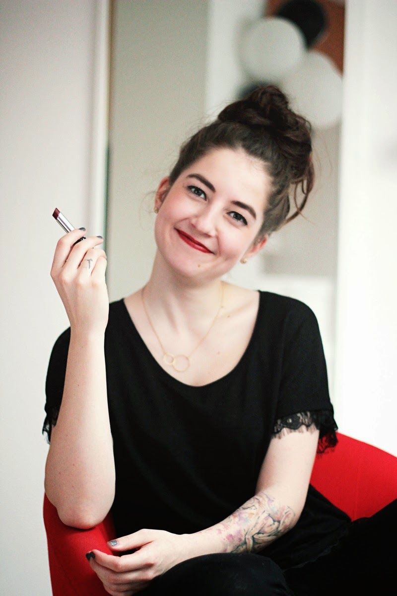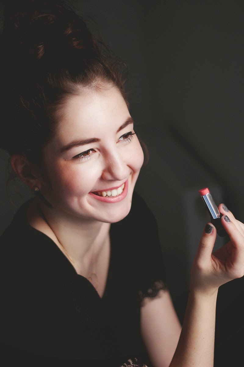 Nude na běžné denní aktivity, lososovou na chvilky s partnerem a ta poslední, RED DAHLIA, si přímo říká o slavnostní večerní událost. Na párty, na ples, na narozeninovou oslavu nebo jen na klidné posezení na víně které se ale s takhle červenou rtěnkou určite zvrhne v divočejší párty! Červená má milion odstínů a říká se, že na každého čeká ta jeho červená rtěnka, kterou už pak nikdy nedá z ruky. Prostě to do sebe všechno zapadne, jako ve velké love story. A víte co? Mám doma několik odstínů a v žádném jsem se nikdy necítila, pořád jsem se kontrolovala v zrcadle, no však to znáte. S touhle do sebe ale vše zapadlo, je to ona! Jestli jste hnědooká tmavovláska, mám pro Vás skvělou zprávu – tenhle odstín je ten pravý pro nás! Myslím, že i z následujících fotek je vidět, že jsem s ní nejvíc spokojená! Baví mě odstín, baví mě příjemná hladina lesku a hlavně to složení rtěnky, díky kterému se nemusím bát, že se mi někde rozpatlá a každý si toho všimne.