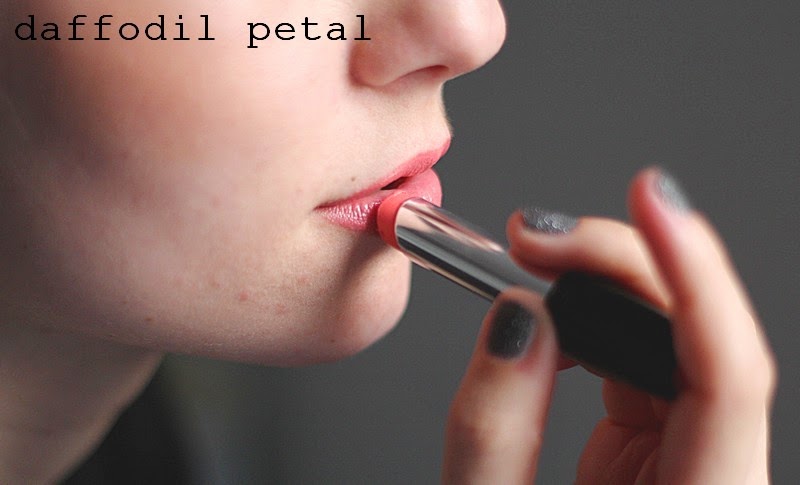 Odstín ideální na romantická randíčka je DAFFODIL PETAL. Když jsem tuhle barvičku uviděla poprvé, dost jsem se vyděsila, lososové odstíny jsem nikdy nepoužívala a při prvním pohledu do zrcadla jsem se trošku polekala, jaké je to na mně neobvyklé. Velmi rychle jsem si ale zvykla, barva mi krásně prozářila obličej a podtrhla zase trochu jiné rysy, než jsem zvyklá a všichni mi jí moc chválí. Je jiná, to Vám garantuju, ale pro mě to je opravdu zajímavá a příjemná změna a jsem moc ráda, že se mi dostala do ruky.