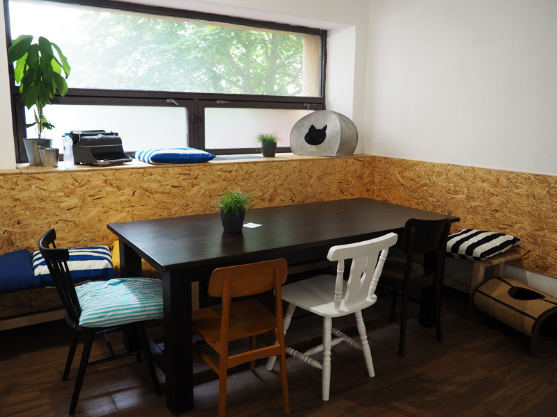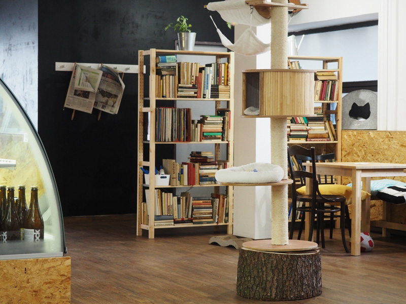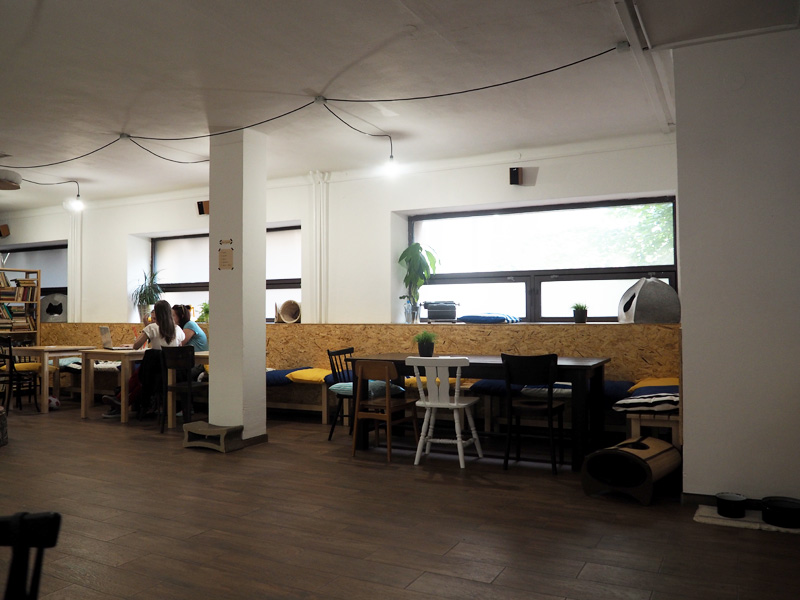 Nachází se v úplném centru města, mezi magistrátem a soudem, tudíž je tam prý v podstatě pořád plno. Prostor kavárny je sice dost rozhlehlý, ale místa na sezení nevyplňují zas tolik prostoru a kavárna tak zůstává vzdušná a zvládnutelná. A je to přesně to místo, kam vejdete a jste v jiným světě. Ruch města je pryč a starosti taky, čeká Vás chvilka dobrýho jídla, příjemných úsměvů obsluhy a chlupatých kožíšků – ale o tom až za chvíli!
