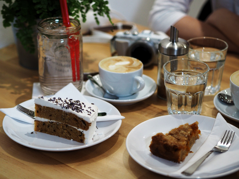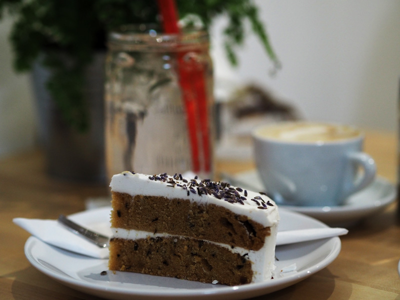 Další důležitá informace je, že kavárna je veganská. Tenhle fakt jsme s holkama předtím nevěděly, takže až při ochutnávání dortíků a kafe jsme si uvědomily, že to chutná nějak jinak! A mně to teda chutnalo moc! Dala jsem si levandulovej dort, kterej by mi klidně stačil k obědu, jak byl sytej a levandulovou limonádu v půl litrový sklenici, o kterou jsme se nakonec všechny podělily. Holky si daly kafe a na to lattéčko si tam teda zajdu v nejbližší době i já! Bylo totiž se sojovým mlíkem a strašně, strašně, strašně dobrý – nějak víc, než klasický sojový latté – ale možná jsem jen zaujatá (a to já jsem často, přiznejme si to :D). Co se týká cen, tak ty jsou trochu vyšší, pro představu latté za 60,-, dort za 65,- a limča za pade. Za sebe ale můžu říct, že to za tu cenu rozhodně stojí. Obsluha je moc příjemná a milá, dokonce jsme dostaly ochutnávku nějakých nových dobrot na účet podniku, interiér jednoduchej a stylovej a jídlo vynikající! Tak co víc si přát?