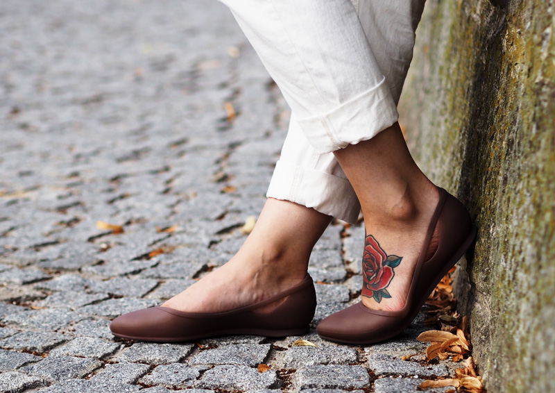 No a na dnešek hlásili konečně trochu ochlazení, takže jsem mohla zvolit bílý boyfriendy (dlouhý kalhoty proto, že mám koleno totálně oteklý od štípanců, to fakt nechcete vidět!) a celkově bílej look, co jsem snad ještě na sobě neměla a jsem si jistá, že jednou to bude fakt all-white. Kalhoty jsem doplnila volným topem a přidala ještě vestu pro ozvláštnění a taky pro to – interní informace – abych si nemusela brát podprsenku, haha. Tady jsem tu bílo-bílou rozbila psaníčkem Muxu z loňských Colours a novýma botkama, kterýma jsou balerínky značky Crocs. No čtete dobře. Crocs totiž nedělá jen ty děravý pantofle, co nosíme na doma nebo když jdeme s košem, dělá i balerínky, žabky nebo parádní platformy – jedny si zrovna pořídila Léňa, mrkněte TADY. Já jsem ve svým botníku doteď žádný baleríny neměla, nemám ráda zavřenou nohu v létě a ani mi nikdy nebyly moc pohodlný. Ale Crocsy na doma mi samozřejmě pohodlný jsou, tak jsem vyzkoušela i jejich balerínky a bingo, jsou pohodlný, dělají hezkou nohu a navíc se ta barva snad s žádnou netluče. Co vy na to jako na celek? 🙂