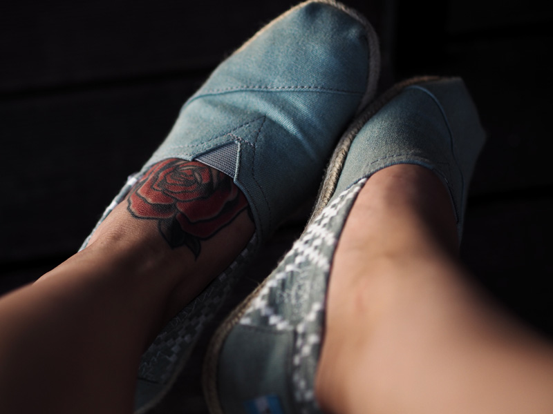 Předposlední fotkou jsou Tomsky, který jsem od tý doby, co mi přišly, sundala asi tak dvakrát. Moje nohy se vzbouřily proti všem botám, co mám a totálně mě trestaj, takže jediný boty, který můžu nosit v klidu, jsou tyhle bačkorky! Díky denimovýmu materiálu se mi teda pěkně blbě laděj, ale aspoň se snažím vymýšlet trochu originálnější kombinace a taky už napjatě očekávám, až zazvoní pošťák s červenou variantou!