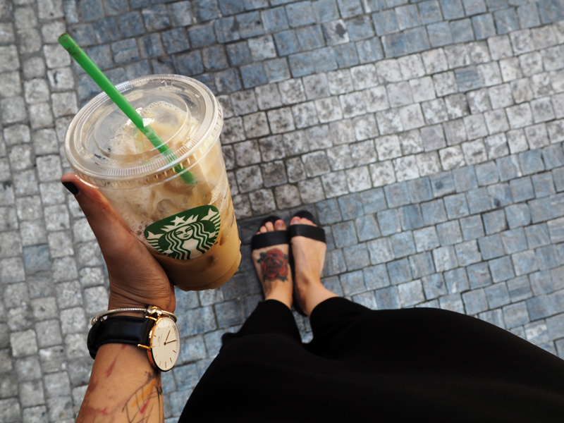 Na instagramu jsem se Vás taky ptala, jaký pití si ve Starbucks dávate nejčastějc, protože moje jediná volba je sojové chai tea latte. V létě teda volím ledový, ale vede u mě to teplý. Pokaždý si taky říkám, že zkusím zase něco jinýho, ale nakonec se mi nechce dávat tolik peněz za něco, co nevím, jestli za to stojí, tak vezmu tuhle svojí volbu a jsem s ní vždy naprosto spokojená. V minulým outfitu jsem ho měla i na fotkách, ale ne proto, že bych si chtěla zapózovat s kelímkem, ale proto, že jsme prostě fotily po cestě z kavárny a mě se nechtělo nechat roztát led, než nafotíme outfit, tak jsem u toho upíjela – no a na Dnes nosím se na mě za to okamžitě obořili, jak překvapivé!