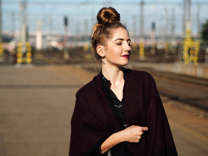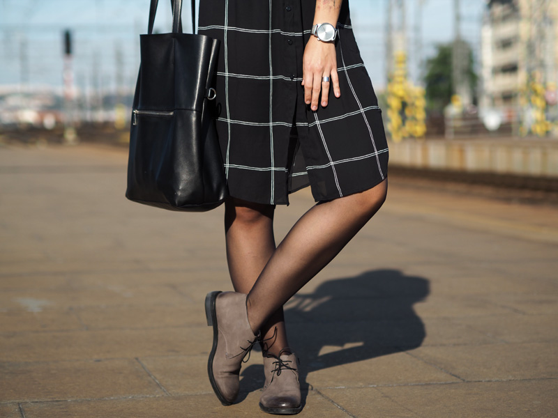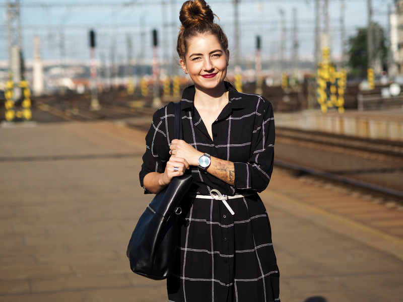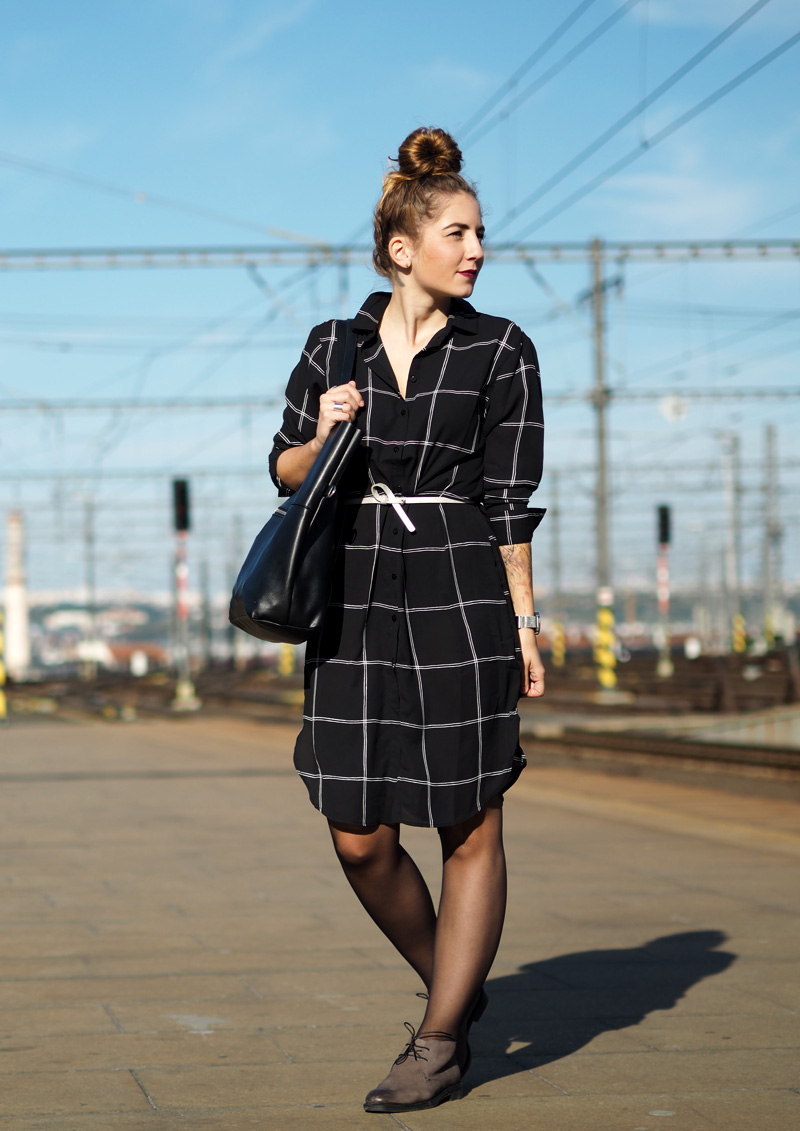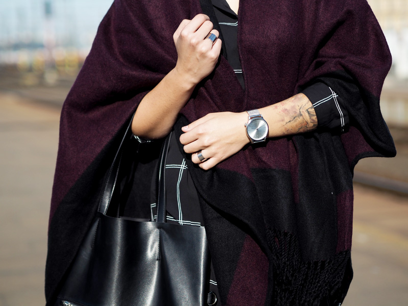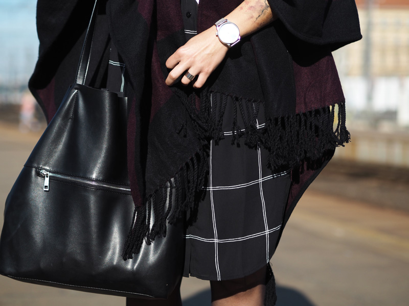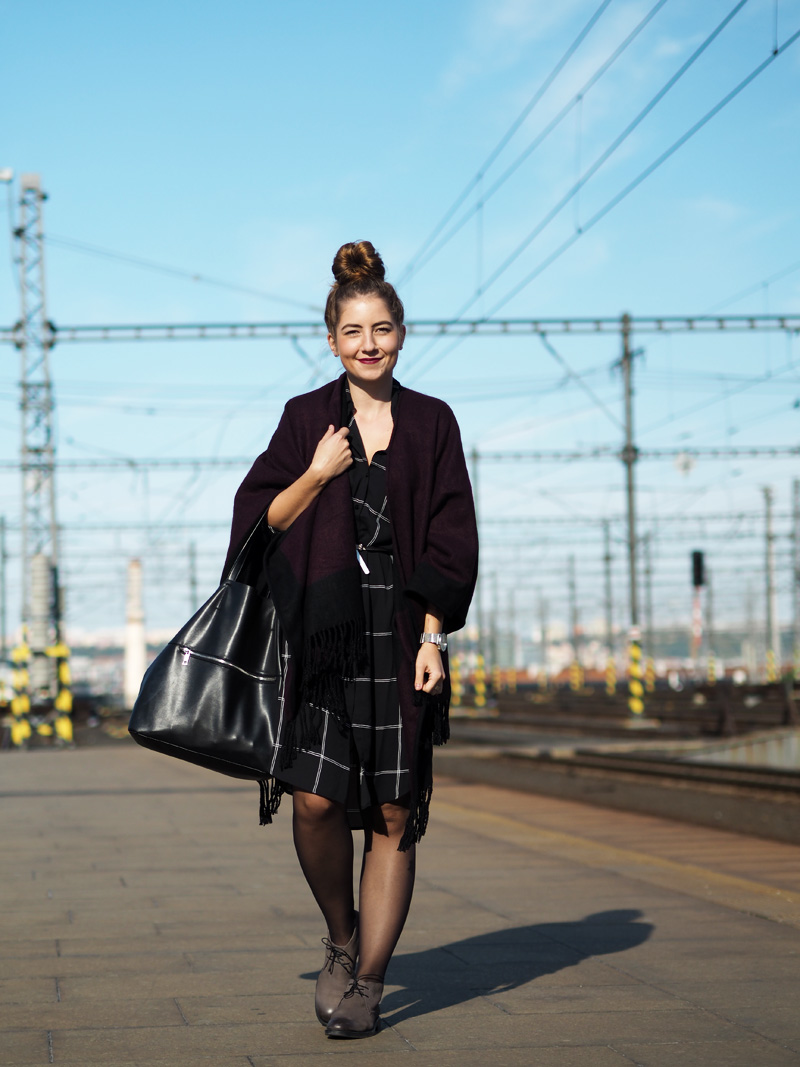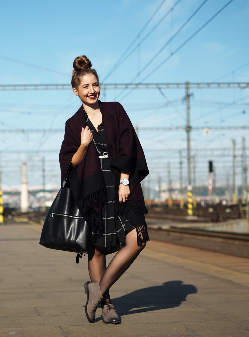 Když si něco zamiluju, potřebuju to pořád. Ať se jedná o cokoliv! Objevím suprovou kavárnu, musím tam každý týden. Koupím novou boží rtěnku, nosím ji nonstop. Začne mi chutnat avokádo, cpu ho do všeho. Koupím si dlouhou černobílou košili, nosím ji pořád a na několik způsobů. Tenhle článek je důkazem toho posledního bodu. Dlouho se mi nestalo, že bych si nějaký kousek tak oblíbila. Naštěstí se nemusím cítit blbě ani když si ji vezmu několikrát po sobě, protože můžu libovolně střídat košili rozepnutou jako jednu z vrstev (vidno v minulém článku TADY) nebo zapnutou jako šaty, což uvidíte právě dnes. Jako šaty je to fakt ohromně pohodlný a ještě se dají samozřejmě přepásat páskem anebo nechat úplně volně jako oversized. Já jsem přes ně v tomhle outfitu přehodila nový pončo v černo-fialové barvě, ke které jsem doladila svou nejoblíběnější podzimní/zimní rtěnku od Rimmelu (odstín Cutting Edge) a přidala boty, který jsem dostala od mamky předčasně k Vánocům a jakmile se mi zahojej puchýře (ano, opravdu mám tak debilní nohy, že se mi odřou i v kvalitních kožených botách..), vyvenčím je znovu. Co na takovej outfit říkáte vy?