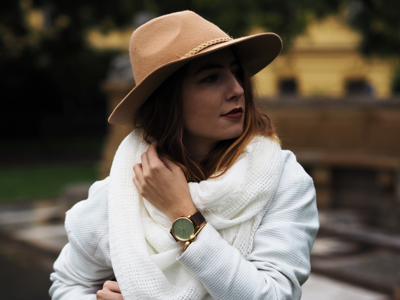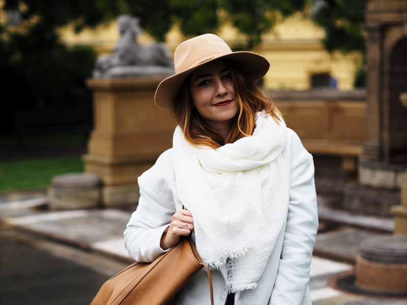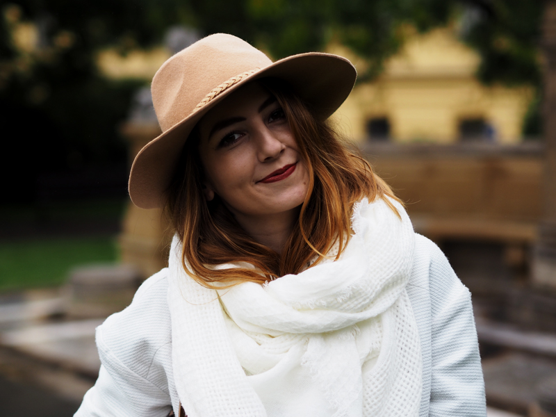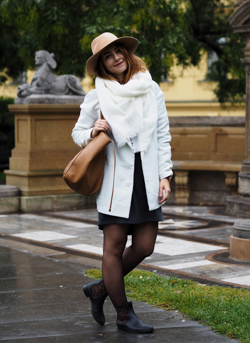 Poměrně dlouho už se tady neobjevil žádnej outfit a to jich mám přitom nafoceno několik. Zrovna tenhle jsem skládala na poslední chvíli pár minut před odchodem, protože pro změnu poprchávalo a potom, co mi ještě v Olomouci ukradli můj průhlednej děštník, jsem si díky smutnění po něm ještě nezvládla pořídit další a samozřejmě jsem nechtěla mít zničený vlasy hned co vylezu před dům. Nasadila jsem teda svůj zatím jedinej klobouk, ve kterým se cítím fakt dobře (ne jako kovboj!!) a k němu levnější-variantu-neverfullky, jak říkám obrovský kabelce z Mohita, kterou nosím moc ráda. Na nohy po půlroce “holinky” a celej outfit jsem vytáhla z davu zářivě bílým kabátem a šálou. Měla jsem z té bílé takovou radost, že jsem se musela celý den usmívat. Všude kolem mě totiž chodili načuření lidi v černý a šedý a já mezi nima byla jak podivný veselý světýlko.