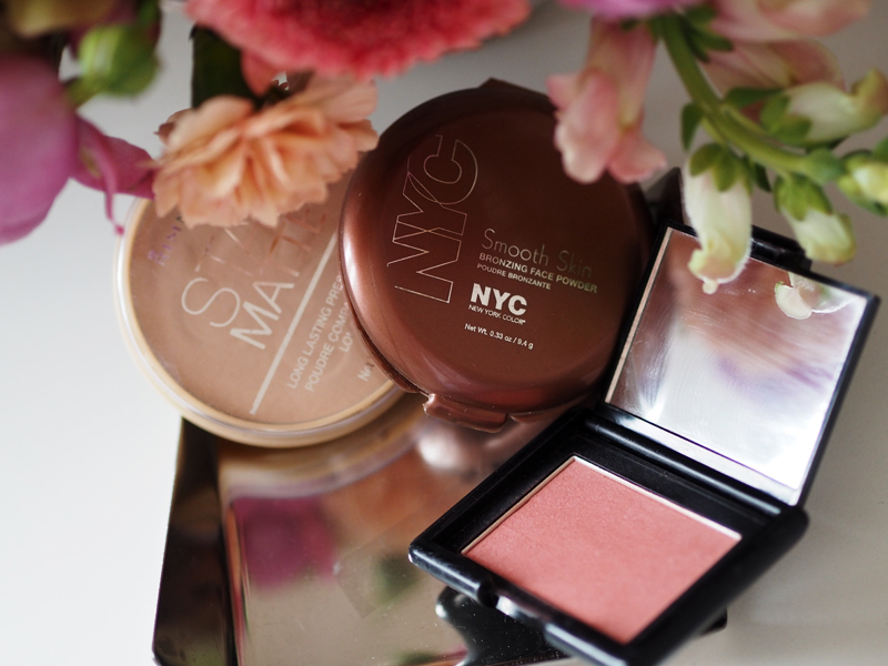 Další přichází na řadu pudr, bronzer a tvářenka. Možná se mi budete smát, ale bronzer používám teprve asi půl roku a pořád si nejsem jistá, jestli to dělám správně. Nejvíc mi teda vyhovuje ten od NYC, přestože vyzkoušený mám i nějaký ze Sephory. Tvářenka je pro změnu Oriflame a kromě ní mám pak ještě jeden odstín a tím opět končím.