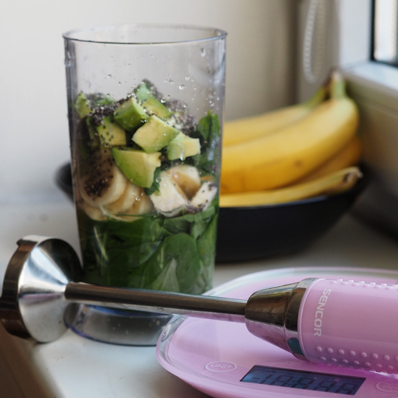 A díky růžovému přírůstku v mé kuchyni si můžu konečně denně dopřávat smoothie všech možných kombinací. Momentálně jedu na těch zelených, takže špenát pokaždý a k tomu různý další věci. Tady třeba banán, avokádo, máta, citrón a chia semínka. MŇAM!