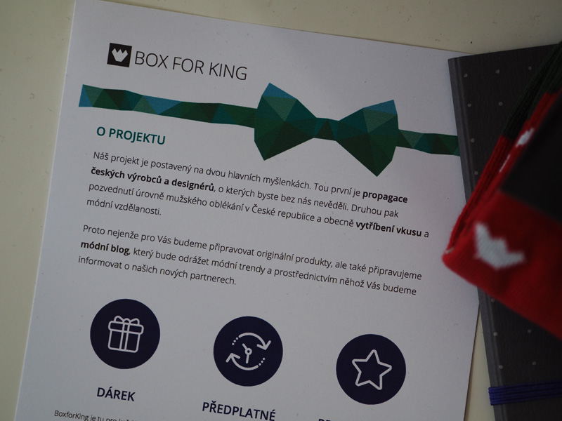 Box for king je krabička plná stylových věcí pro muže. Pro holky máme nějakej beauty-box na každým rohu, pro kuchařky to stejný. Ale pro pány? To tady přece chybělo! A co když má někdo doma fešáka, co se rád parádí, má rád originální stylový věci a navíc si užívá překvápka? Pokud jednoho takovýho doma máte, je tohle přesně něco pro něj! Box je projektem založeným na dvou věcech – první je podpora českých návrhářů a designérů a druhá je snaha o vytříbení vkusu mužů v Čechách.
