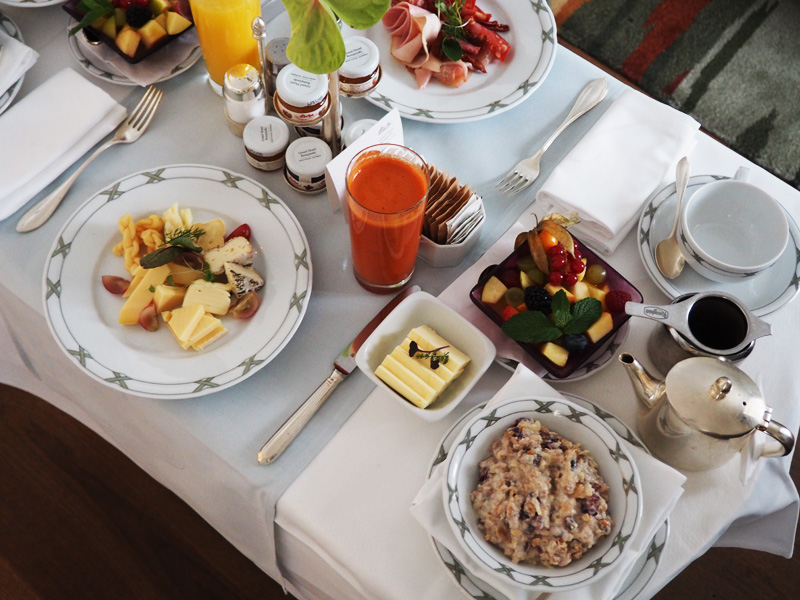 A protože se dala objednat snídaně na pokoj, nedalo nám to a vyzkoušeli jsme to taky. V obrovský jídelní kartě jsme si zaškrtali, co všechno bychom rádi a čas “doručení” a už od večera jsme se na to těšili. Hotelový snídaně jsem měla ráda vždycky, ale tohle předčilo veškerý moje očekávání! A tak jsme si to všechno hezky v županech vyskládali na postel, pustili si MTV, koukali z okna na sněhovou vánici a skoro dvě hodiny snídali v posteli. Samozřejmě jsme si poctivě fotili (i když tu teplou část snídaně jsme si nechali pro sebe – respektive nechali jsme ji v horkým boxu, aby nám během focení nevychladla, takže tady toho vidíte tak půlku, haha). Každopádně těhlech snídaňovějch fotek mám spoustu a přišlo mi škoda vybrat jen tak dvě do článku, takže si počkejte na další, jooo?