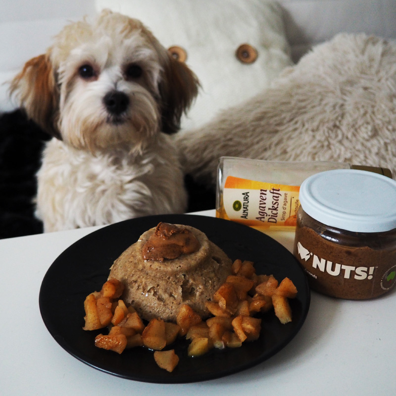 Další mugcake, tentokrát s poskořicovanýma rozvařenýma jablkama. A v pozadí ukňouránek, co vleze nejen do postele, ale málem i na stůl!