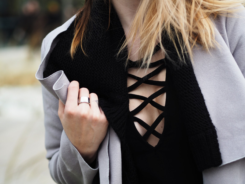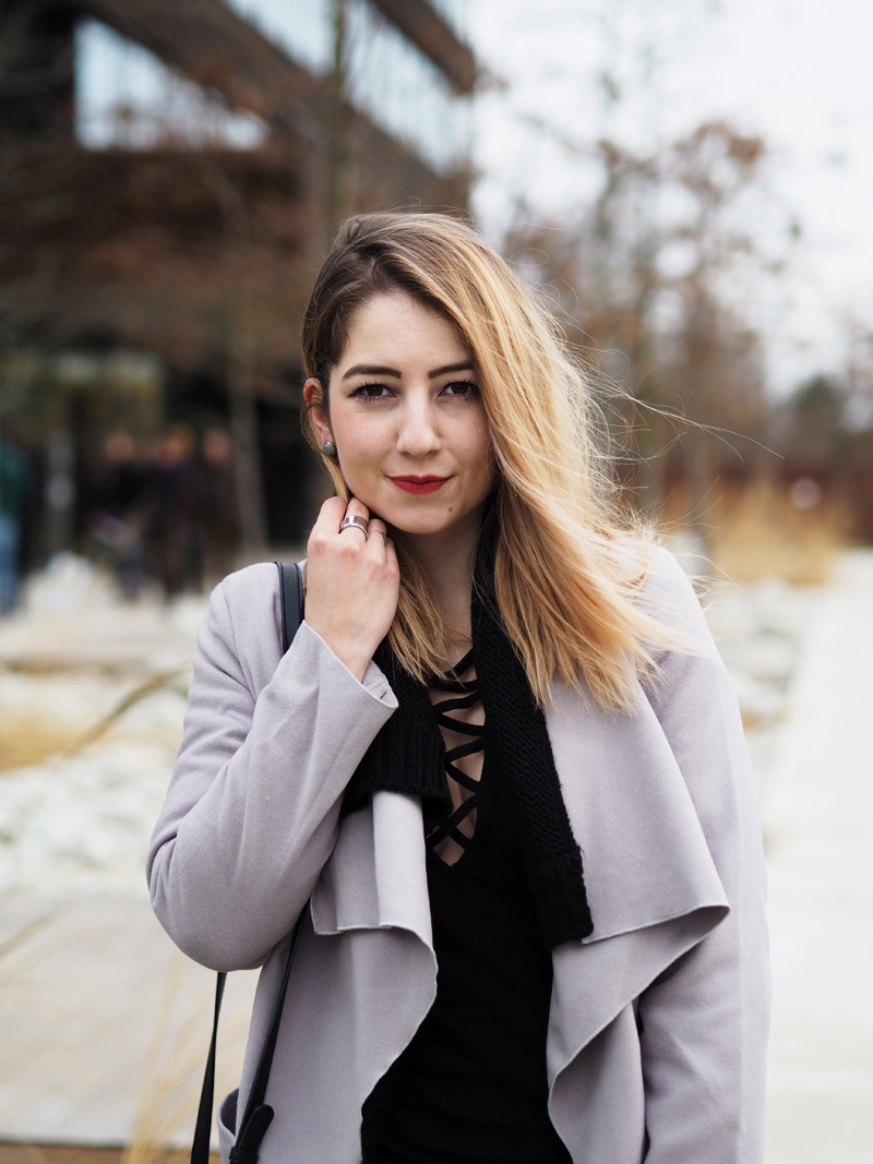 Coat – SHEIN / dress – SHEIN / sweater – MANGO OUTLET / bag – MANGO / shoes – ČAS NA BOTY / ring – CALVIN KLEIN / lipstick – BOURJOIS VELVET EDITION 07