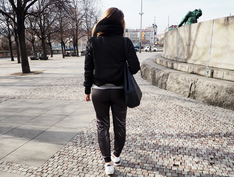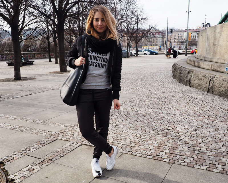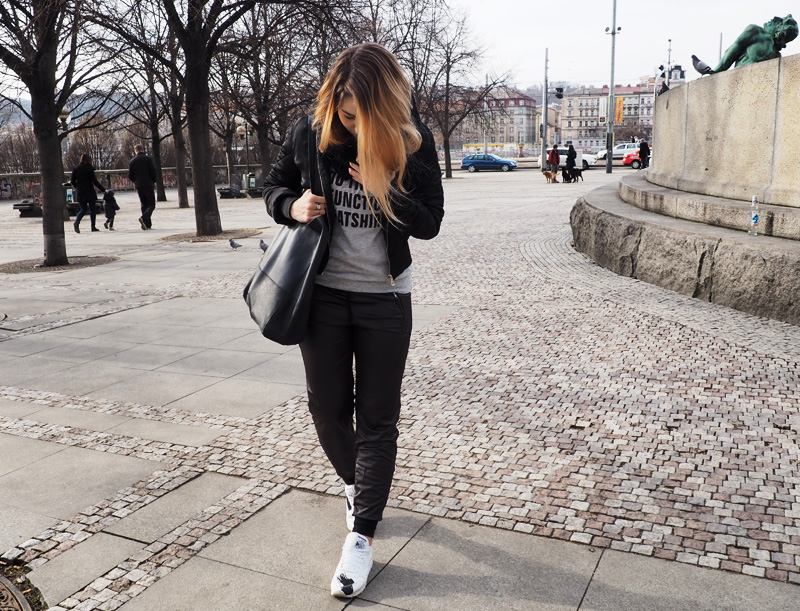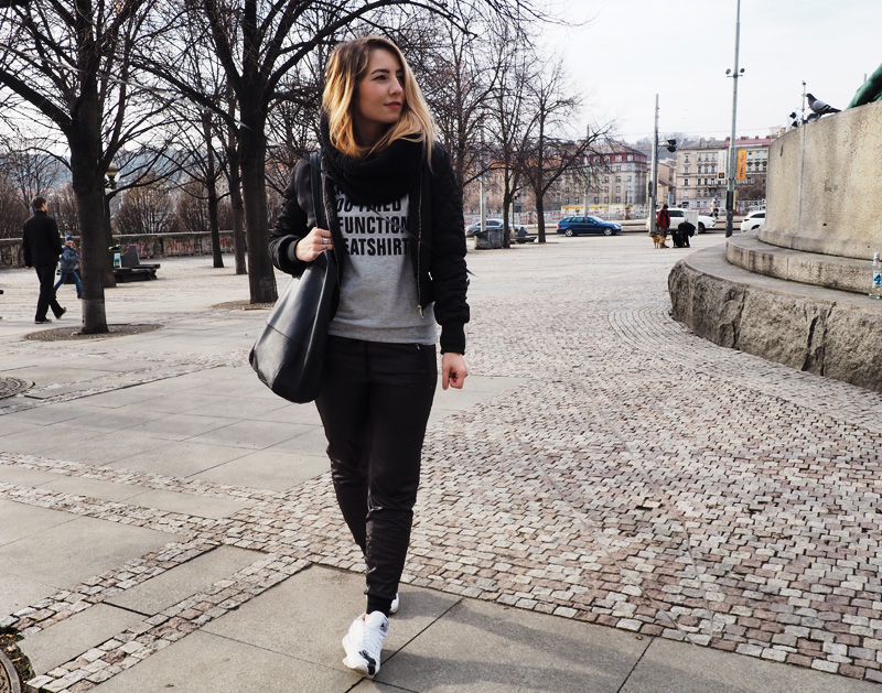 No a když to focení outfitu nevyšlo napoprvé, řekla jsem si, že to cvaknem jen někde po cestě na základní objektiv a nebudem to komplikovat. Takže takto! V týdnu jsme byli nakupovat ve Fashion Aréně a já jsem si v Calzedonii pořídila tyhle super pohodlný a příjemný kalhoty/tepláky, no a k nim jsem včera přidala mikinu, která má naprosto perfektní nápis, kterým se mi nejlíp hodí na víkend (“This is my too tired to function sweatshirt”), černej bomber a kruhovou šálu, co mi upletla babička <3