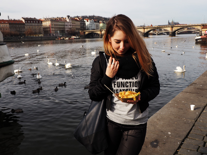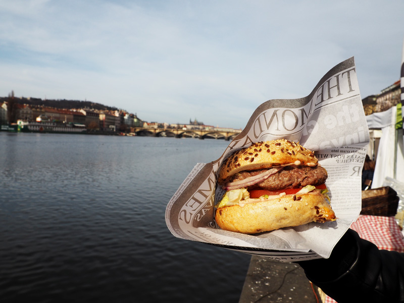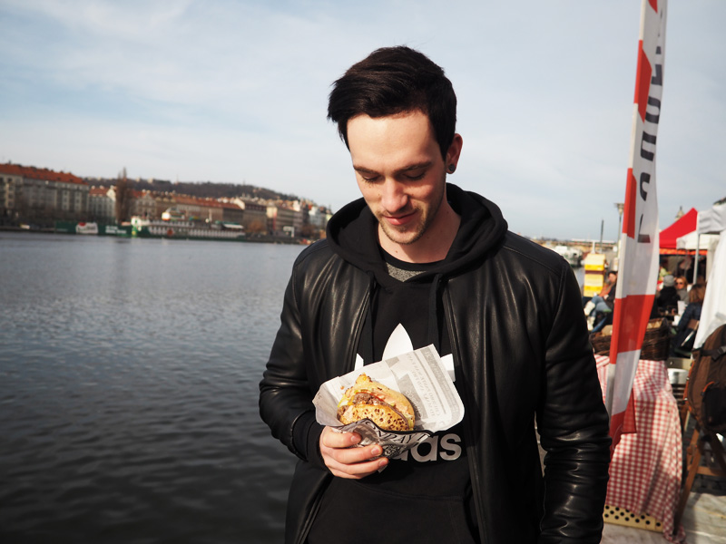 Kuba zvolil bio-burger a napadalo to do něj tak rychle, že jsem si stihla kousnout jenom jednou :D. Aspoň teda můžu říct, že mu chutnal. Já normálně moc burgerová nejsem, protože mi vadí, jak se to blbě jí a všude z toho něco padá, ale s výhledem na řeku, labutě a všechny ty šťastný lidi, co si to po Náplavce štrádovali, bych ho zvládla sníst i celej ve vší spokojenosti. Ale randíčkový jídlo to prostě není, to mi nevymluvíte!