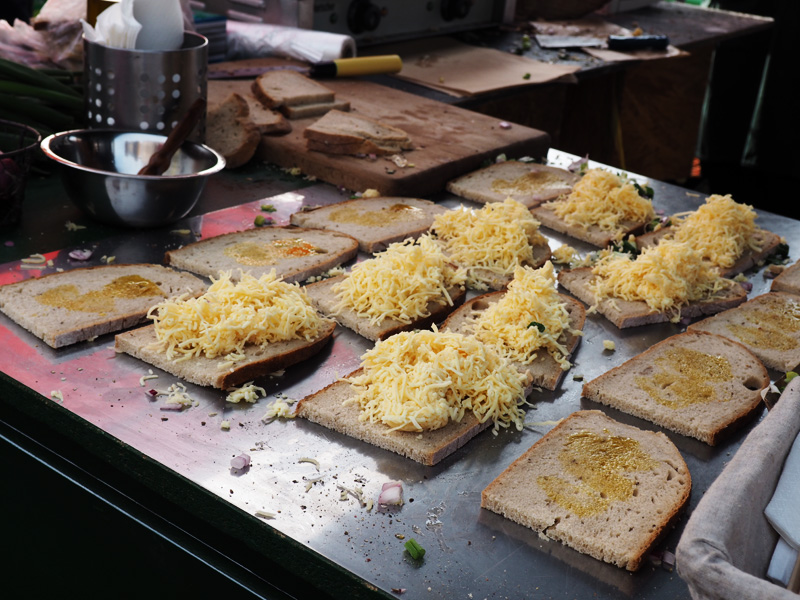 Já jsem si potom vybrala oběd u stánku s nejdelší frontou (jak jinak!), která se navíc hejbala strašlivě pomalu. Rozhodně to ale stálo za to! Jako první chod jsem si vybrala toust s lanýžovým olejem, francouzským sýrem a cibulkou, kterej byl moc super, ale nakonec jsem trochu litovala, že jsem si do toho nenechala přidat nějakej spešl salám, co by tomu určitě dodal výraznější chuť.