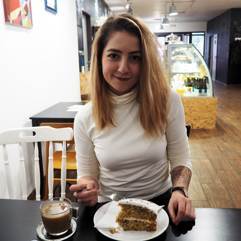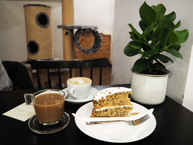 No a na zákusek jsme skočili právě do Koček. Nebyla jsem tady snad sto let a strašně jsem se těšila. A o to víc, když jsem u nich na instagramu den předtím zjistila, že zas mají levandulovej dort. Omg omg omg. Nejlepší věc na světě. Všechno levandulový je nejlepší na světě, proto ji mám i vytetovanou, žejo. A k tomu chai masala (dvakrát…..). DO-KO-NA-LÝ.