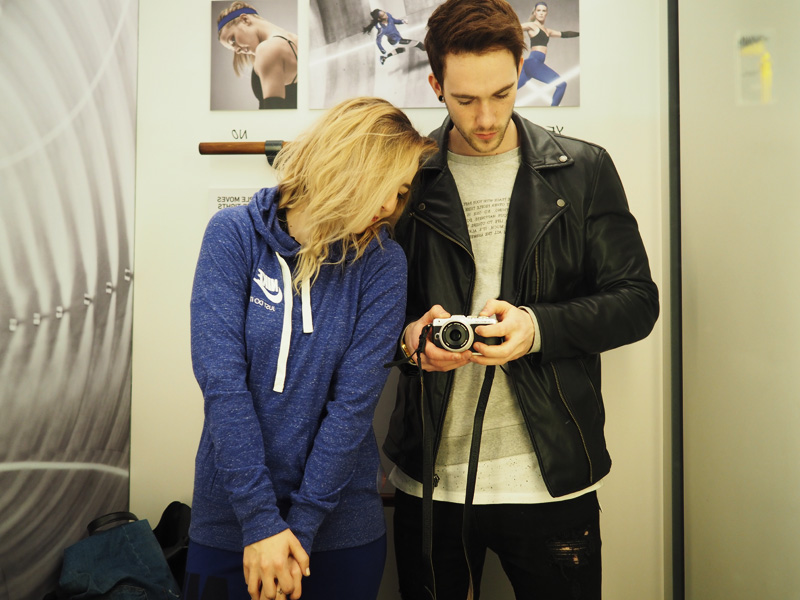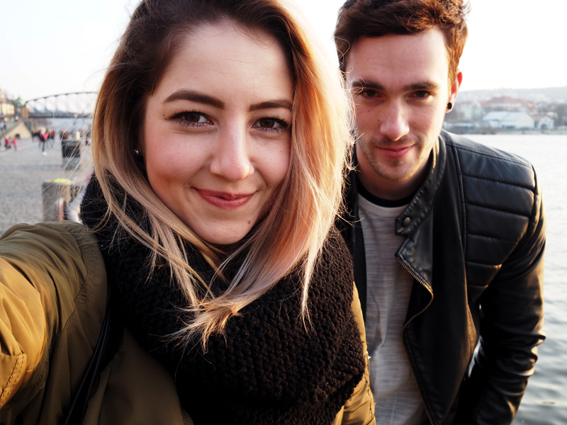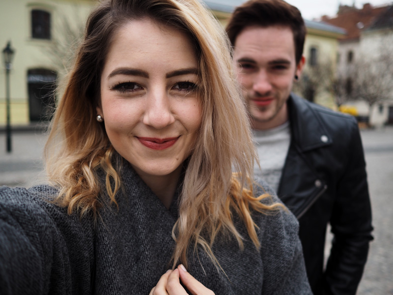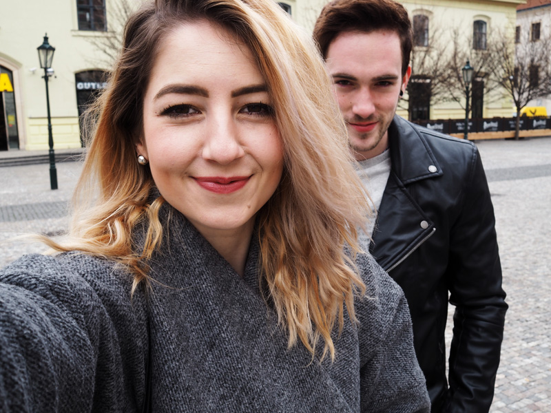 Tady vidíte dokonalou ukázku rozdílu mezi focením na manuál a na automat. Fotka nahoře je nastavená z focení outfitu – tudíž na nejnižší clonu vytvářející rozostřený pozadí, proto jsem na selfíčku ostrá jen já. Na fotce dole je nastavenej automat, kterej si sám odvodí, co to fotím a jak asi chci, aby to vypadalo, rozezná na fotce dvě tváře a clonu vystřelí nahoru. Takže je nakonec ostrý všechno včetně jmen obchodů za námi. Moje rada teda zní – foťte na manuál, kdykoliv máte možnost, ty fotky jsou pak mnohem zajímavější! Já používám automat jen ve chvíli, kdy potřebuju něco vyfotit rychle a nechce se mi to nastavovat.