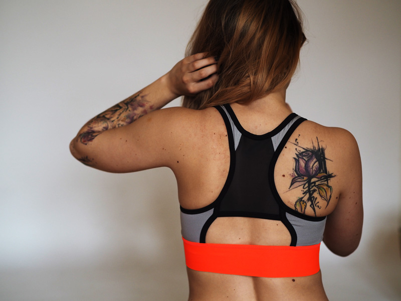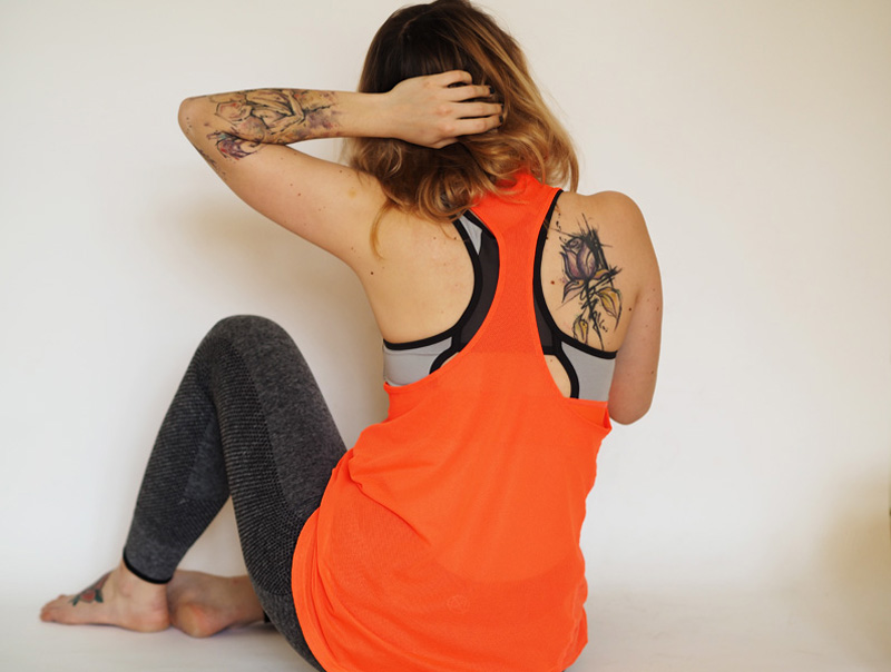 Svítivě oranžovej top a podprsenku pod ním mám z H&M, ta jejich sportovní edice mě neuvěřitelně baví a navíc je cenově docela přijatelná. Hodně se mi líběj i věci v Lindexu, jenomže poslední dvoje legíny, co jsem si tam vyhlídla, byly při pohybu (třeba dřepu) průhledný. A to fakt nechci. Čímž chci říct, že Vám dávám tipy jen na ty neprůhledný, rozumíme si, jo? 😉 Tílko má prodyšnej materiál a akorát by teda mohlo být trochu kratší nebo jinak vykrojený, něco mi na něm prostě nesedí.