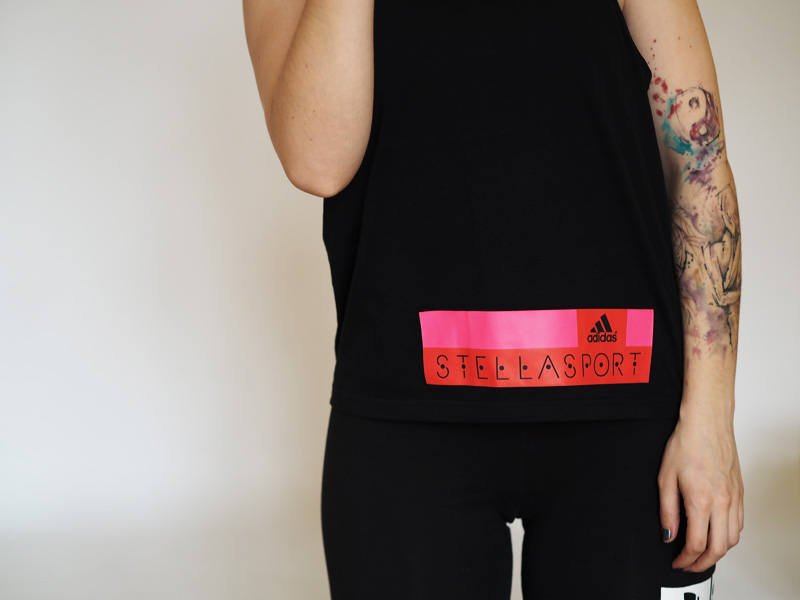 Kolekce Stella mě nadchly uplně pokaždý a když jsem na svý první blogerský přehlídce dostala právě tohle tričko v bílo-zelený variantě, myslela jsem, že ho budu nosit jen na spaní. Bylo mi velký a dost barevně nesladitelný. Pak jsem začala cvičit a ve slevách v Adidasu objevila tuhle barevnou variantu. A byla moje a je jedním z mých nejnošenějších kusů. Protože je volný, pohodlný…a Adidas.