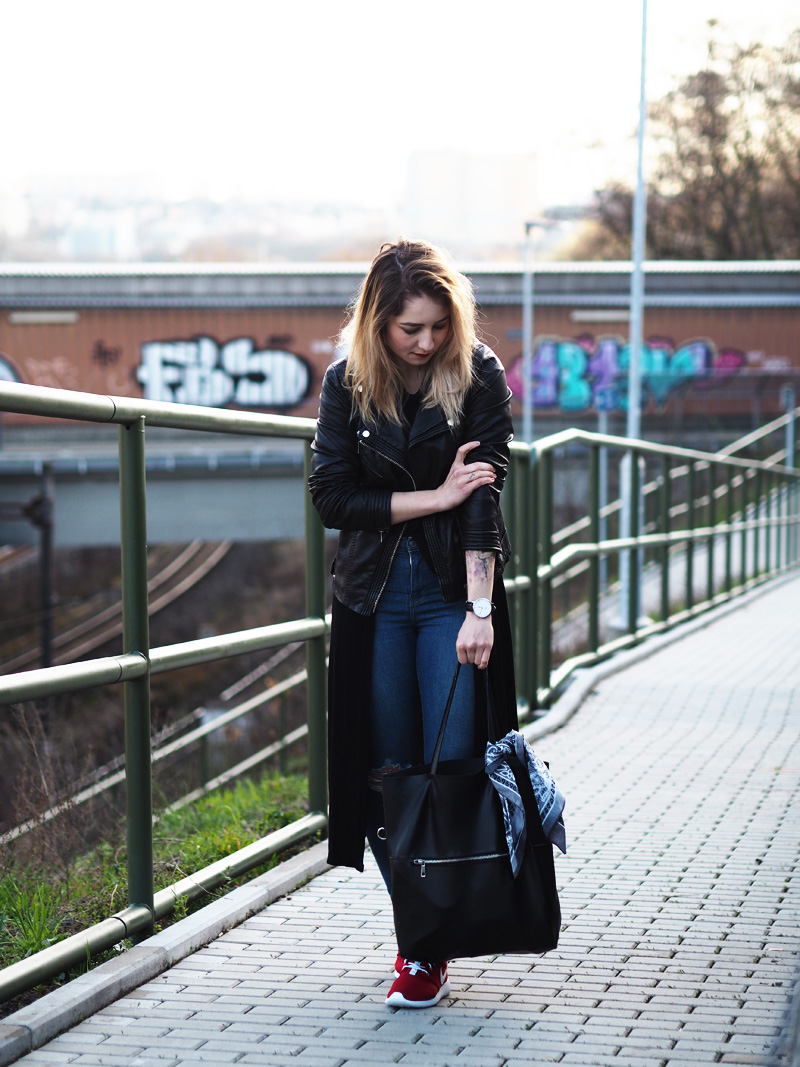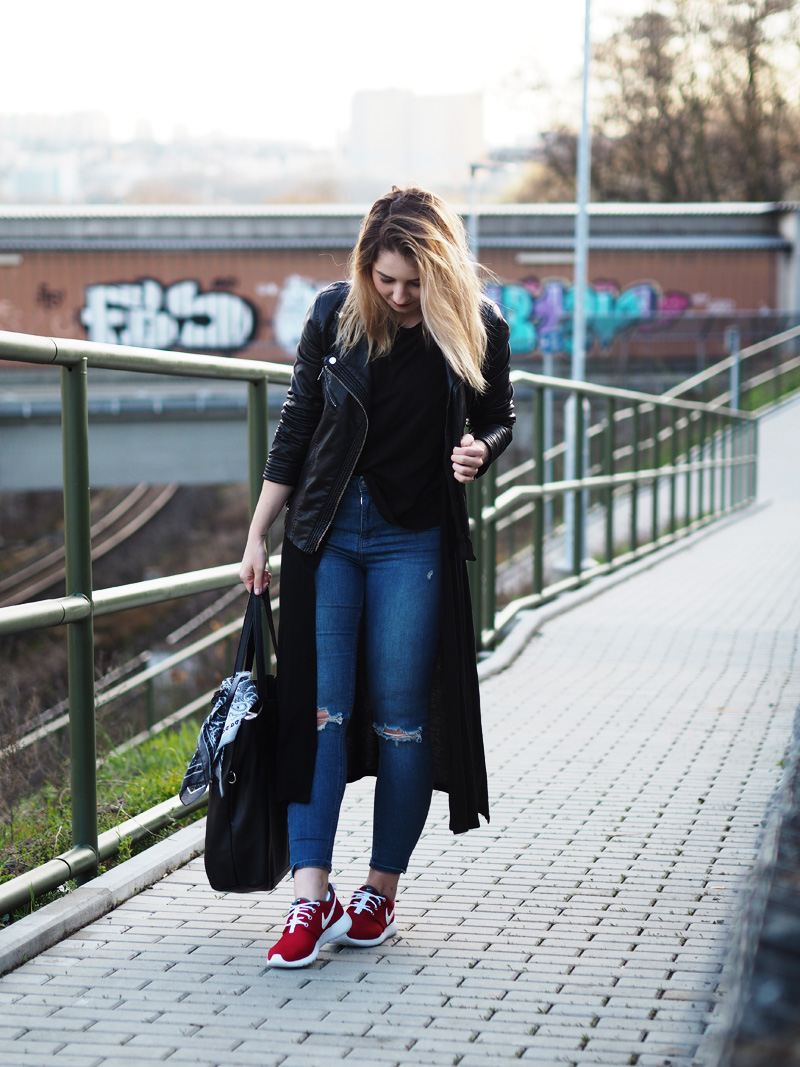 V outfitu můžete vidět můj narozeninovej dárek v akci – vysněný červený Roshee, který se příteli podařilo sehnat bůhvíkde, protože já je nemohla v kamenných obchodech objevit už pár měsíců. Možná mám doma kouzelníka, kdo ví. Každopádně je miluju, jsou neuvěřitelně pohodlný a ta červená mě prostě baví. Stejně jako s Tomskama, i s těmahle ladím rtěnku a pak mi přijde celej look úplnej. A poslední věc – na tomhle místě fotíme vždycky ve chvíli, kdy už se schyluje k západu slunce, protože je tady pak nejlepší světlo. A navíc bydlíme asi minutu daleko.