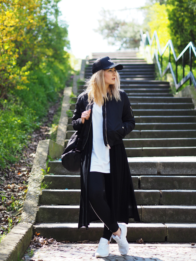 Dnes se Vám hlásím s outfitem, kterej bych nejraději nosila 24/7. Sportovní boty a legíny, nejsuprovější oversized triko, dlouhej svetr, navrch bomber a na hlavu samozřejmě kšiltovku, na kterou jsem si přes počáteční nákupní nejistotu zvykla tak, že bych ji mohla mít na hlavě pořád. Je strašně zajímavý, jak změna trávení volnýho času ovlivní Váš styl celkově. Životní styl, modní styl, styl myšlení. Všechno prostě. A mě to neuvěřitelně baví. Jak ta změna outfitů, tak změna v myšlení a pohledu na svět. Občas sice fňukám, že se výsledky dostavujou moc pomalu, ale pak to všechno zpětně porovnám a jsem spoko. Občas sice fňukám, že nerozumím ekonomii, ale nakonec si připadám uplně hustě, když něco doopravdy pochopím a večer před zkouškovu se cejtím fakt chytrá (škoda, že přes noc se tenhle pocit někam vytratí :D). Občas mám pocit, že je uplně všechno špatně, ale stačí se na to podívat z jinýho úhlu, najít si pro věci uspokojivý vysvětlení, opřít se o lidi, kteří tady pro Vás jsou a smířit se s realitou. Občas si o něco zabojovat a občas nechat plavat věci, co za boj nestojej. A hlavně se nechat nabíjet pozitivní energií z každý maličkosti, která Vás během dne potěší.