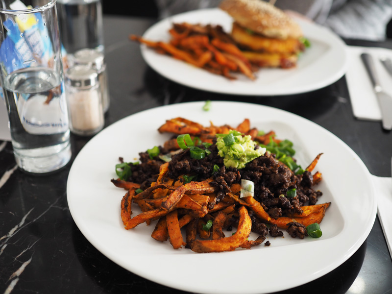 Ve FitFoodie jsem už jak doma, není týden, kdy bych tam nešla aspoň jednou, spíš ale víckrát. Naprosto jsem tomu propadla a líbí se mi tam úplně všechno. Milými majiteli a obsluhou počínaje, jednoduchým interiérem (kterej je sice poměrně chladnej, ale je to prostě bistro a ne útulná kavárna), vynikající nabídkou a dokonalejma dezertama konče. Jednou z mých nejoblíbenějších variant jídla je mleté hovězí maso s guacamole a batátový hranolky.