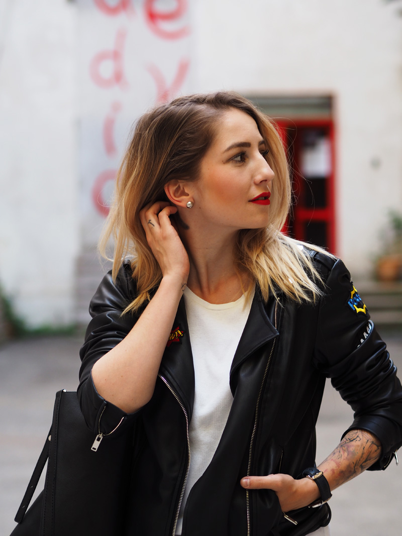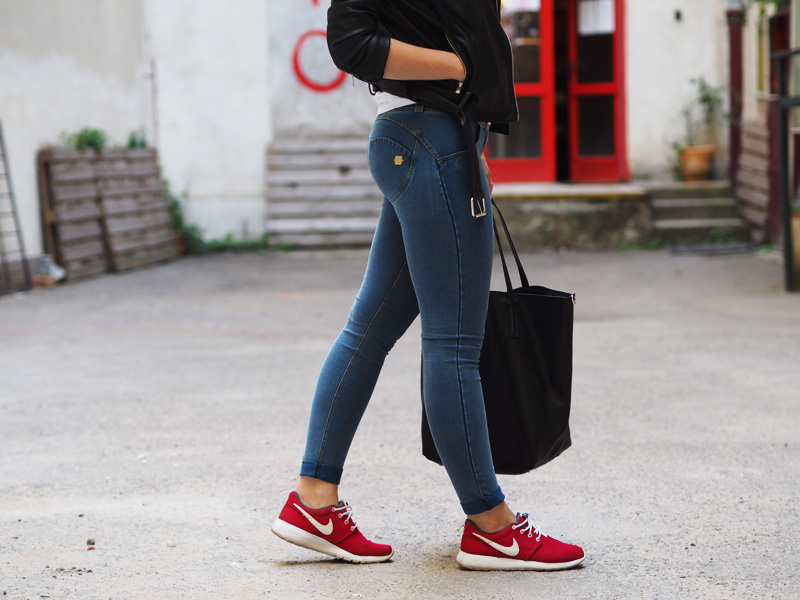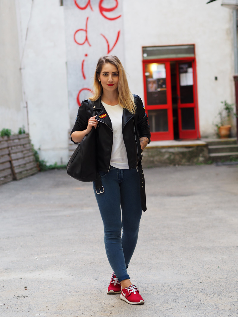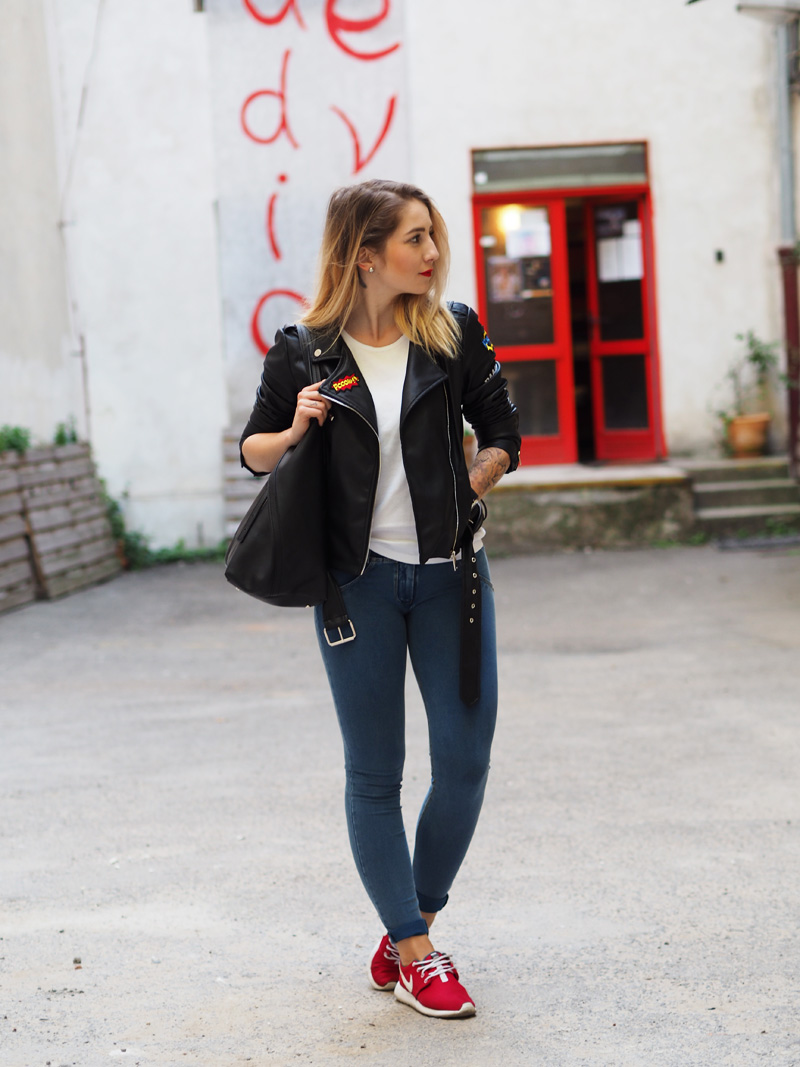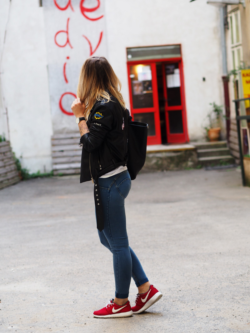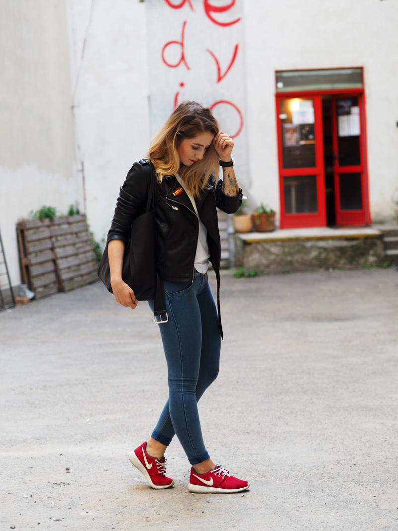 Já jsem Vám říkala, že jsem si ten trend nášivek zamilovala! Tahle bunda je mým nejnovějším přírůstkem a rovnou si vydobyla první místo v žebříčku mých oblíbených kusů v šatníku a sklízí pochvaly ze všech stran. Sehnala jsem ji v Mohitu, kam jsem šla primárně pro rifle s nášivkama a místo nich jsem si odnesla právě tuhle bundu a ještě tričko v podobným stylu. Další novinkou jsou nový Freddy, do kterých jsem investovala část peněz z mojí hlídací brigády, protože jsem si je zasloužila a protože prostě…ehm..je nejspíš fakt potřebuju ve všech základních barvách. Určitě Vás to zas spoustu znechutí, jak už jsem s těmahle kalhotama zvyklá, ale já z nich jsem prostě nadšená, jsou neuvěřitelně pohodlný a skvěle podtrhujou to, co chci aby podtrhovaly a cejtím se v nich skvěle – což je to hlavní. No a k tomu už jen nejmilejší Roshee od přítele a jednoduchý líčení, který jste mi hrozně chválili minule. Po cestě do kina na X-Men Apokalypsu (což je mimochodem totální pecka!!!) jsme u Senovážnýho náměstí náhodou našli tenhle vnitřní blok s posprejovanejma zdima, rozbořenejma cihlama a dveřma, co mi ladily ke rtěnce, tudíž místo focení bylo jasný a já jsem dost spoko. Jak se to líbí Vám? Myslím jako celej, zkuste se nezaměřovat jen na ty-strašný-fuj-divno-kalhoty.