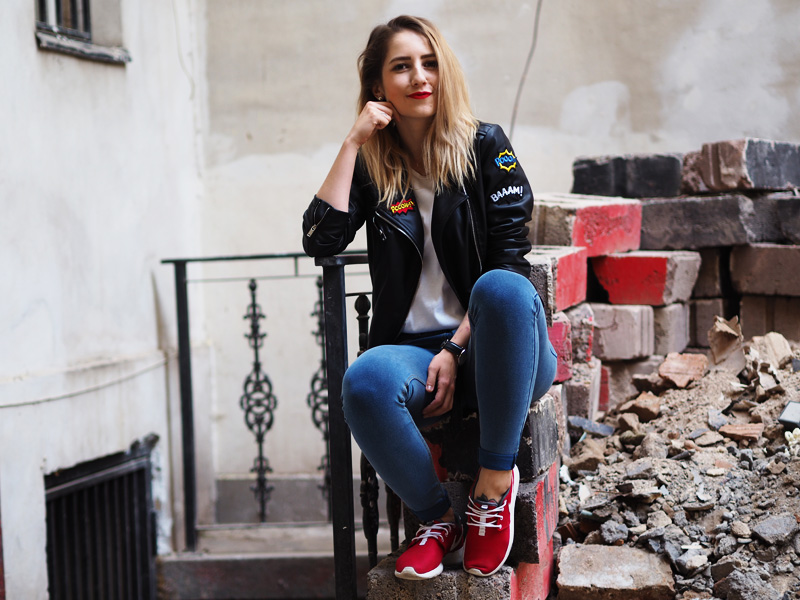 Já jsem Vám říkala, že jsem si ten trend nášivek zamilovala! Tahle bunda je mým nejnovějším přírůstkem a rovnou si vydobyla první místo v žebříčku mých oblíbených kusů v šatníku a sklízí pochvaly ze všech stran. Sehnala jsem ji v Mohitu, kam jsem šla primárně pro rifle s nášivkama a místo nich jsem si odnesla právě tuhle bundu a ještě tričko v podobným stylu. Další novinkou jsou nový Freddy, do kterých jsem investovala část peněz z mojí hlídací brigády, protože jsem si je zasloužila a protože prostě…ehm..je nejspíš fakt potřebuju ve všech základních barvách. Určitě Vás to zas spoustu znechutí, jak už jsem s těmahle kalhotama zvyklá, ale já z nich jsem prostě nadšená, jsou neuvěřitelně pohodlný a skvěle podtrhujou to, co chci aby podtrhovaly a cejtím se v nich skvěle – což je to hlavní. No a k tomu už jen nejmilejší Roshee od přítele a jednoduchý líčení, který jste mi hrozně chválili minule. Po cestě do kina na X-Men Apokalypsu (což je mimochodem totální pecka!!!) jsme u Senovážnýho náměstí náhodou našli tenhle vnitřní blok s posprejovanejma zdima, rozbořenejma cihlama a dveřma, co mi ladily ke rtěnce, tudíž místo focení bylo jasný a já jsem dost spoko. Jak se to líbí Vám? Myslím jako celej, zkuste se nezaměřovat jen na ty-strašný-fuj-divno-kalhoty.