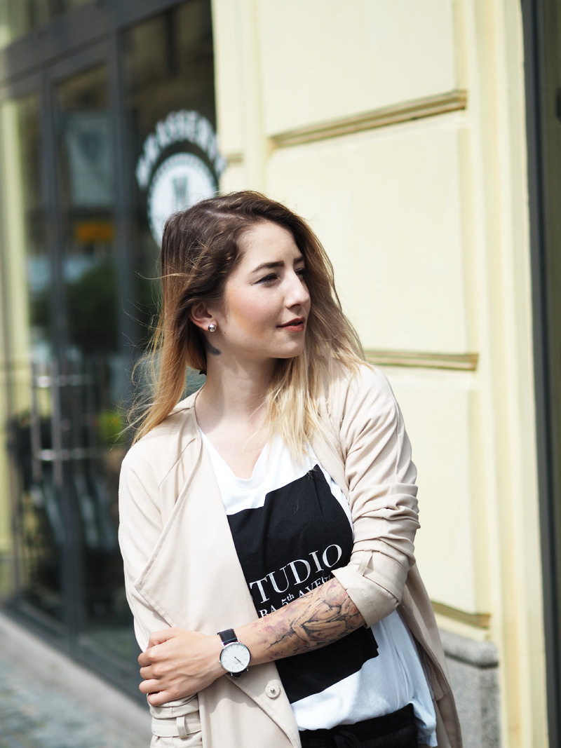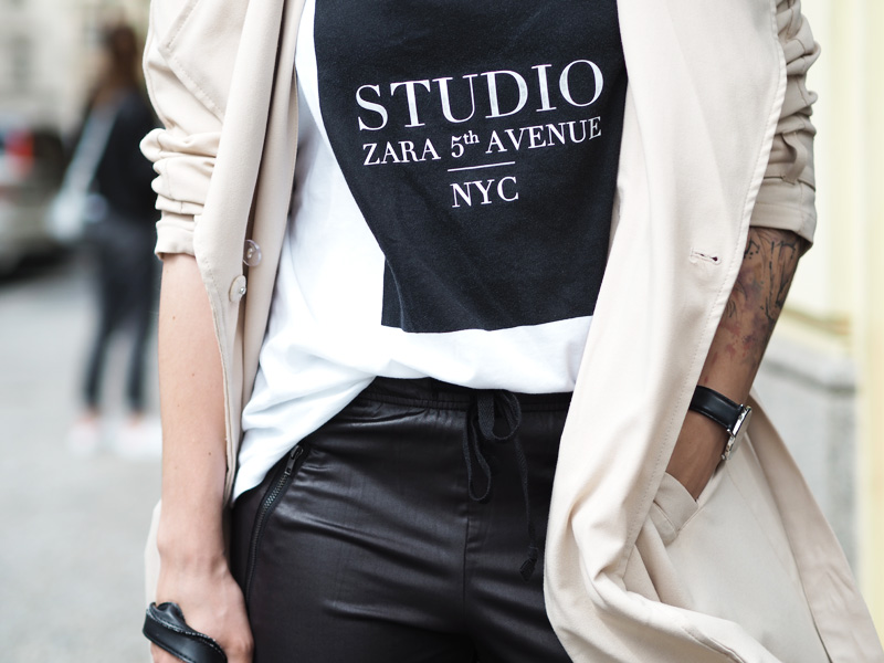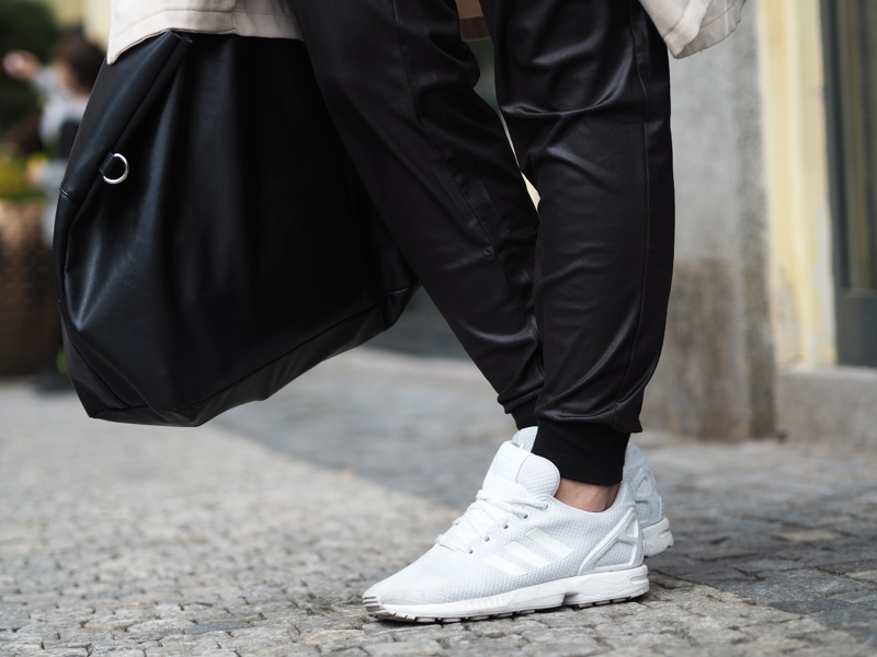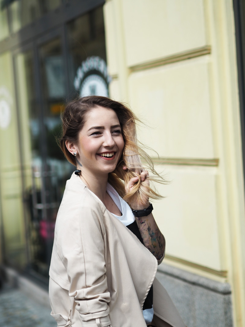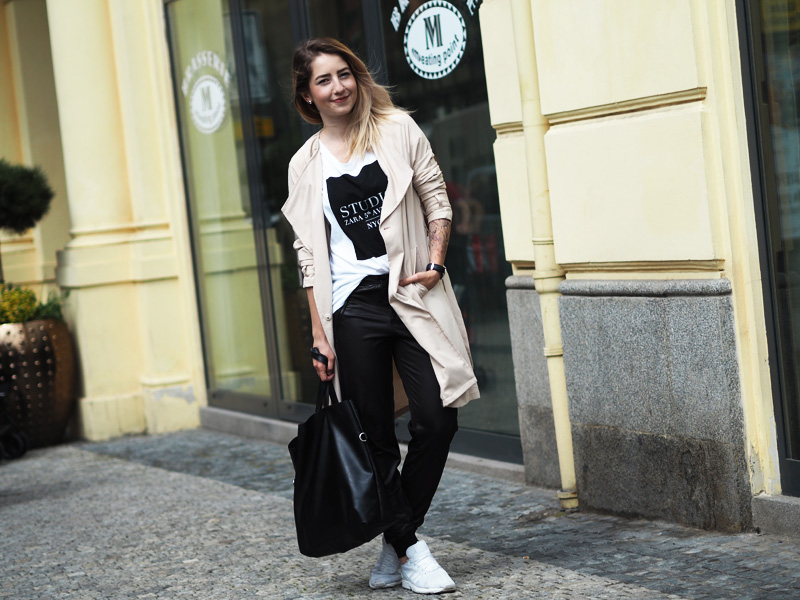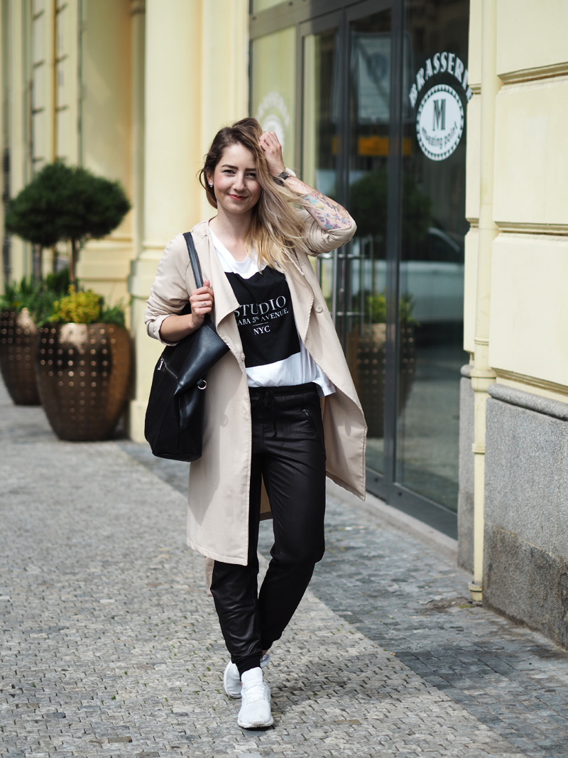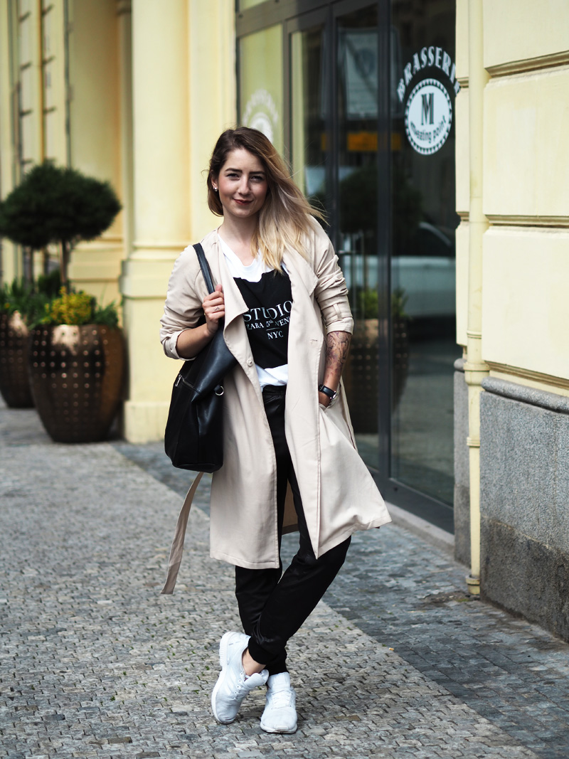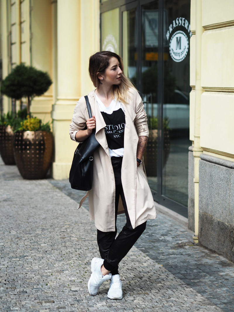 Hrozně mě teď baví fotit outfity. S přítelem už jsem na to skvěle sehraný, já konečně nosím věci, na který jsem se celou zimu těšila (trenchcoat <3) a co je hlavní – spousta věcí, co mi loni byla hodně těsná a uplně jsem se v nich necítila, mi teď je docela jinak. A to mě fakt baví. A cítím se díky tomu dobře a mnohem radši se fotím. Tyhle kalhoty jsou toho jasným důkazem. Kupovala jsem je někdy v zimě, kdy jsme s Kubou prochodili křížem krážem Fashion Arénu a nakoupili tam nějaký sportovní věci a věci do bytu v Tchibu. Já jsem k tomu přidala ještě nějaký spodní prádlo a tyhle lesklý tepláky, který mi ale v době nákupu byly spíš jako legíny :D. Proto jsem nad jejich koupí váhala, nicméně jsem si řekla, že přece hodlám něco zhubnout a že pak budou fajn…a to se mi zdá, že teď docela jsou. Takže jsem s Váma chtěla tuhle radost sdílet. No a navíc mě taky neuvěřitelně baví tahle kombinace “barev” – černá, bílá a béžová. A trench s teniskama.