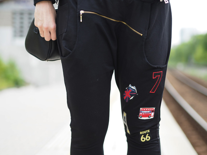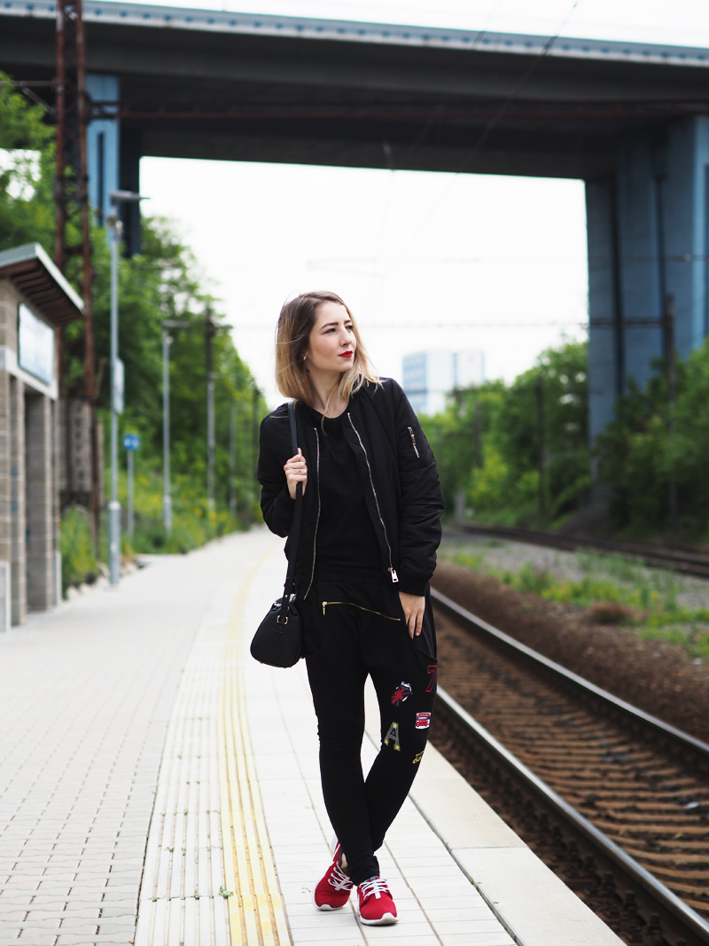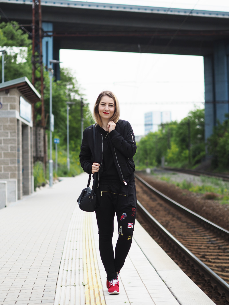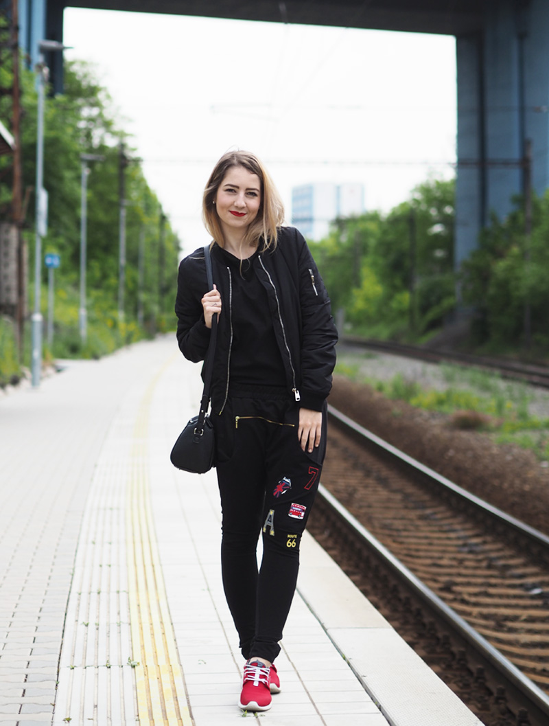 Ahoj, ahoj! Zdravím Vás z postele, kde se poslední dva dny nacházím nejčastěji, protože detox režim mě dost odrovnává z provozu :D. Včera jsem celý odpoledne prospala, dnes jsem teda šla aspoň plavat a podrobně Vám to všechno popíšu až bude po všem a já budu zase vesele kousat pevný jídlo. Dnes ráno jsem totiž s vypětím všech sil zvládla nafotit outfit, ve kterým jsem si šla pro dávku Uga na dnešní den. Zatímco Kuba snídal vajíčka – na který nikdy nemám chuť a tentokrát bych je nejradši snědla i s pánví :DD – udělala jsem si lehkej make-up a místo linek tentokrát zvolila červenou pusu a připadám si v tom hrozně zmalovaně, přitom jsem v podstatě nalíčená mnohem míň než dřív. Hlavně jsem Vám ale chtěla ukázat tyhle tepláky*, který naprosto miluju, stejně jako celej ten nášivkovej trend, ve kterým už mám jedny košilošaty, triko, tyhle tepláky a nově i koženkovou bundu – a fakt se těším, až Vám to všechno ukážu. Jak se k tomuhle hravýmu barevnýmu trendu stavíte vy? Já jsem z něj fakt nadšená, jen hádám, že na jeho kombinování se musí jít hodně opatrně!