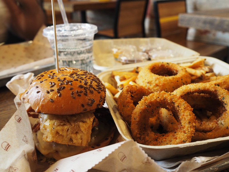 Místo na oběd jsme tentokrát neměli vybraný předem a když jsme náhodou narazili na další pobočku Bare Burgeru, bylo jasno. Já jsem původně chtěla zvolit salát – byl ale mega drahej a navíc bez masa. Druhá volba byla teda sendvič – jenže díky tomu, že u každýho jídla píšou kalorie, zjistila jsem, že je to v podstatě to samý jako burger… Takže jsem si dala ten burger 😀 zas ananasovej, podruhý za sebou. No jo no.