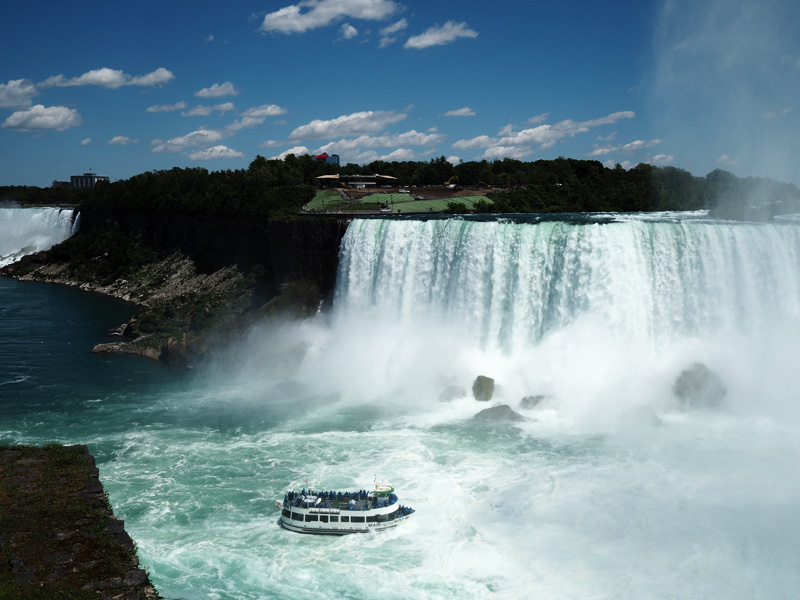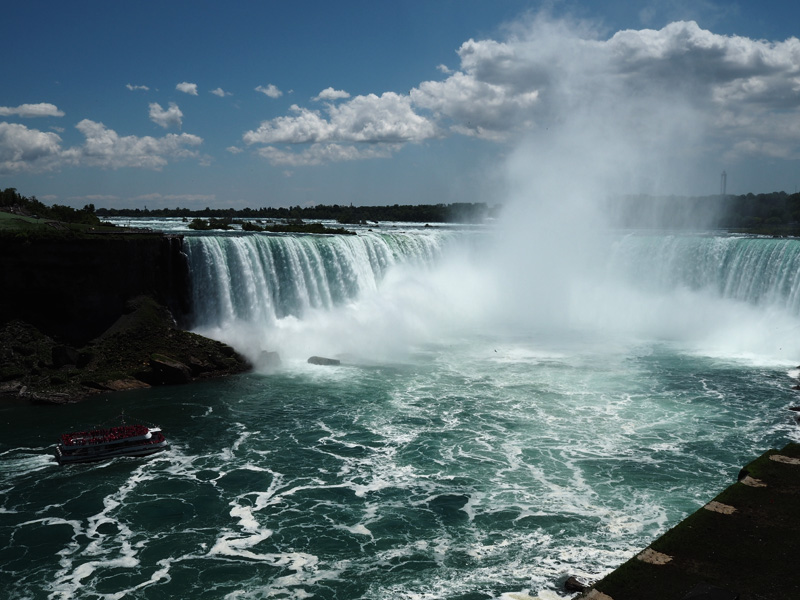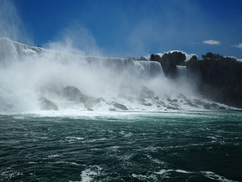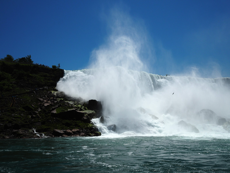 Neumíte si představit ten pocit, když jste přímo tam, kousek od toho, kam dopadají ta kvanta vody (154 milionů litrů za minutu!!!), neslyšíte vlastního slova, každou chvíli vás skropí voda a vy s křikem schováváte foťák pod pláštěnku, přičemž se křečovitě držíte zábradlí, protože ta velká loď se slušně kejve pod těma přívalama vody. Po odjezdu dál se mi trochu uleví, ale trvá to jen chvíli – hned bych se tam zas vrátila, protože to byl pocit k nezaplacení a adrenalin jak blázen i s těma všema lidma okolo, který jsem oproti svýmu očekávání sotva vnímala.