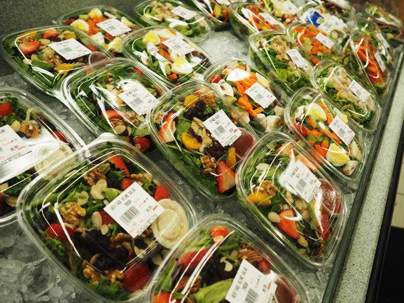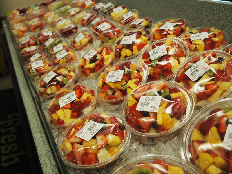 Strašně dlouho nám pak ale trvalo najít obchod s jídlem. Když jsem se někoho zeptala na radu, poslal mě dvakrát na místo, kde měli jenom různý brambůrky, zmrzku a sušenky. Nakonec se nám ale podařilo najít obchod, ze kterýho jsem byla uplně vedle a musela jsem prozkoumat každou druhou věc. Nejvíc se mi samozřejmě líbily tyhle mističky s ovocem a zeleninový saláty.