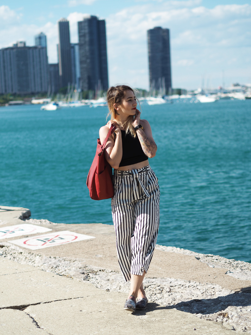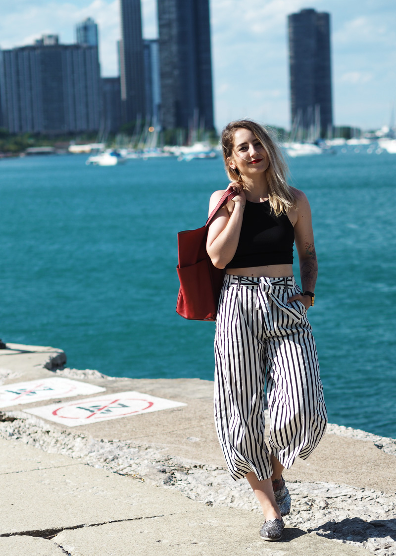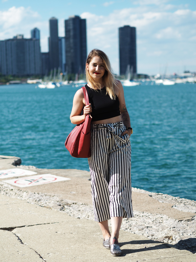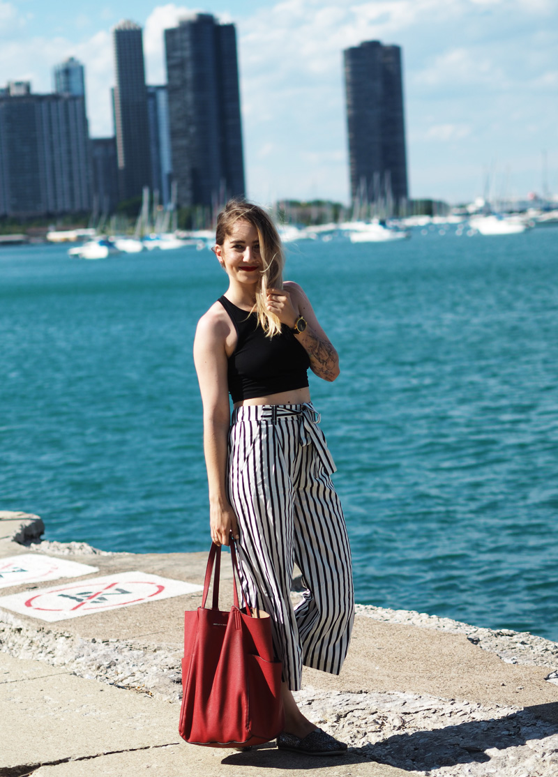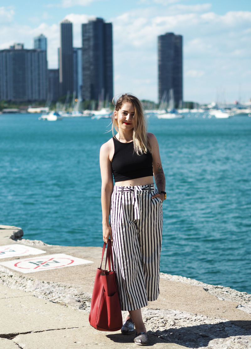 Vzhledem k tomu, že byla moje mami tak hodná a šikovná, že mi nafotila outfit, přináším Vám ještě před dalším deníčkovým článkem ukázku toho, co jsem měla na sobě poslední den v Chicagu a zároveň to, co jsem si tam koupila co mi bylo první den koupeno. Z americký Zary jsem byla nadšená, byl tam mnohem větší výběr než u nás a když jsem uviděla tyhle “pyžamový” cullotes, už jsem si to s nima šupajdila do kabinek. A s vrškem taky, protože crop topama moje skříň (natož cestovní kufr) rozhodně neoplývá. Tenhle den bylo zrovna pěkný vedro a protože jsme celej den chodili v podstatě podél vody a stíny mrakodrapů na nás nedosáhly, spálila jsem si ramena a ten pruh na břiše :DD. Je to moc krásný, věřte mi. Teď nás ale čekají tři dny v Torontu, kde je pro změnu pěkně hnusně. Nicméně musím zatím říct, že je to snad nejlepší rodinná dovolená na jaký jsem kdy byla, protože to není jen klasika válení se na pláži a neustálý žraní v rámci all-inclusive (ne že bych to nedala líbit :DD), ale spoustu toho nachodíme, objevíme a mě se tak úžasně zvětšuje rozhled a zároveň i touhy ohledně dalších životních směrů. Kromě toho mám taky radost z toho, že jsem docela schopná si tady hlídat i jídlo, volit většinu zdravejch variant a za jeden den jsme nachodili už třeba i 22km, takže ani to fitko není až tak nutně potřeba, protože večer padám do postele totálně vyřízená a s bolavejma nohama.