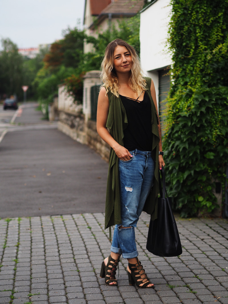 OdpovědětVymazatDžíny vyvážený podpatkama, takže nezkrátí trup, šňůrky ve výstřihu se příjemně opakujou na botách, vesta prodlužuje siluetu, barvy ti sednou k typu, za mě opravdu dobrý – včetně tašky!!! 1*