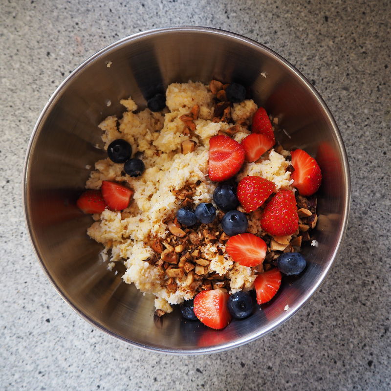 Nejjednodušší a pro mě nejmenší přijatelná snídaně, kterou volím v případě, že mě dopoledne čeká kardio, kterým chci hned od začátku pálit tuky a nečekat, až spálím přijaté ranní sacharidy. Takže třeba před inline bruslením, na který jsme s přítelem začali pravidelně chodit.