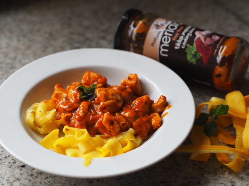 Z jejího složení (rajčata, kokosový mlíko a koriandr) jsem byla tak nadšená, že jsem ji hned druhej den po doručení musela vyzkoušet a udělat si vynikající oběd. Kuřecí maso s cuketovýma nudlema (udělanýma škrabkou a následně orestovanýma na pánvi) s tou omáčkou to bylo nebe v puse, který je navíc strašně rychle uvařený a taky sněděný, haha.