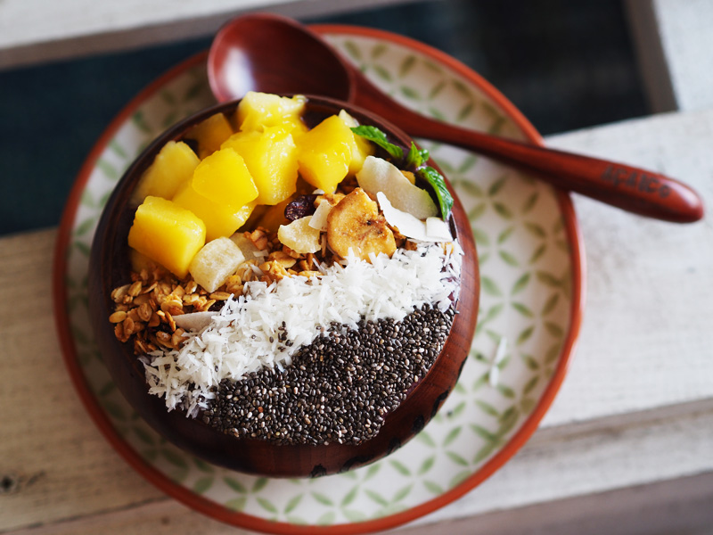 Jedna větší, která byla dost možná v jednom z extra letních dnů i obědem. Kromě obvyklých posypek (chia,kokos,granola) i jáhlové a amarantové pukance.