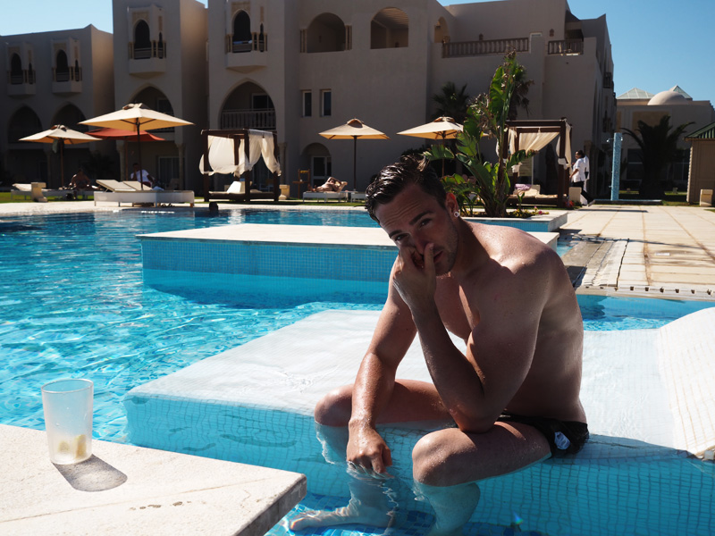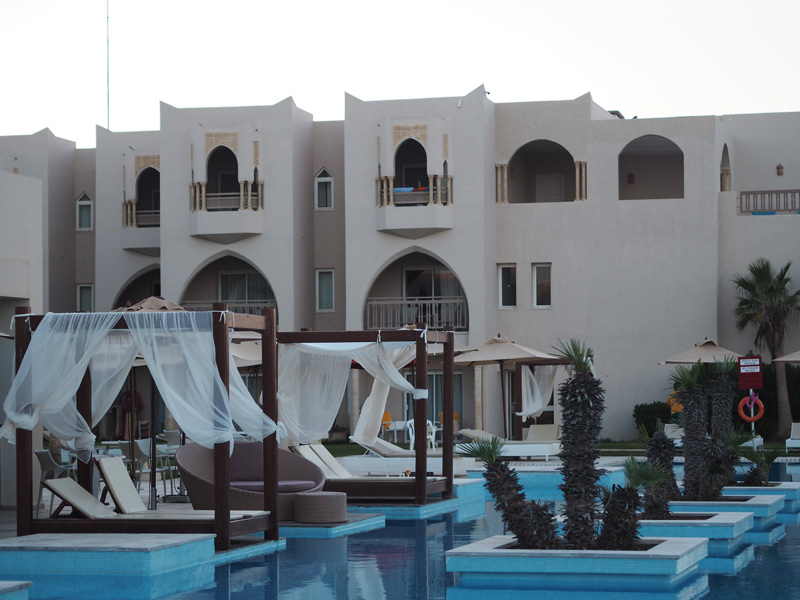 Cesta byla sice strašná, let dlouhej a navíc bez jídla, takže jsme byli nuceni si hlady koupit předražený bagety na palubě letadla a na Djerbě nás čekala hodinová policejní kontrola, což je vlastně dobře, ale v tu chvíli nás to dost otrávilo. Stačilo pak ale vkročit do hotelu a do pokoje a nejlepší nálada byla okamžitě zpět, protože – yaaaay, jsme tady, fakt se to děje!