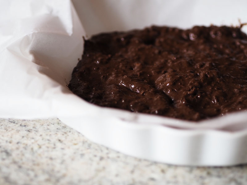 A pečeme na 200 stupňů zhruba 20 minut, stav kontrolujem párátkem a pokud už se na něj těsto nelepí, brownie je hotovo.
