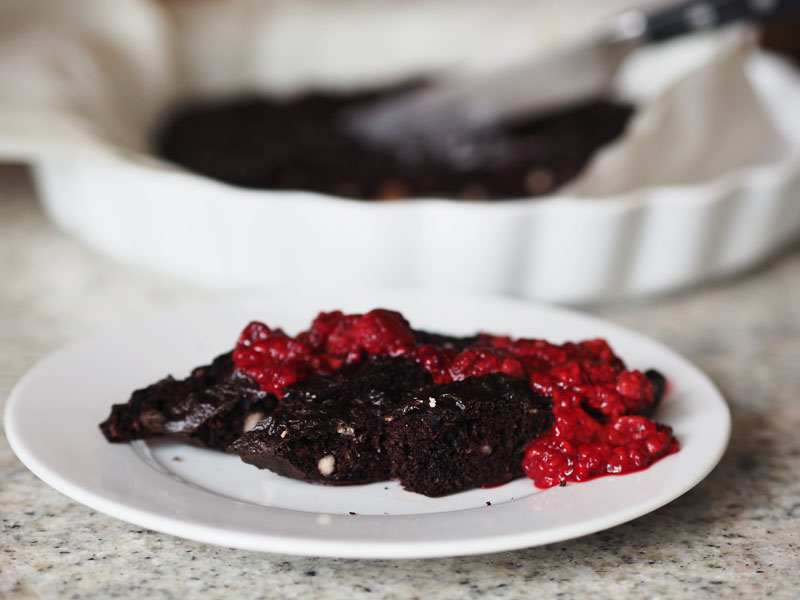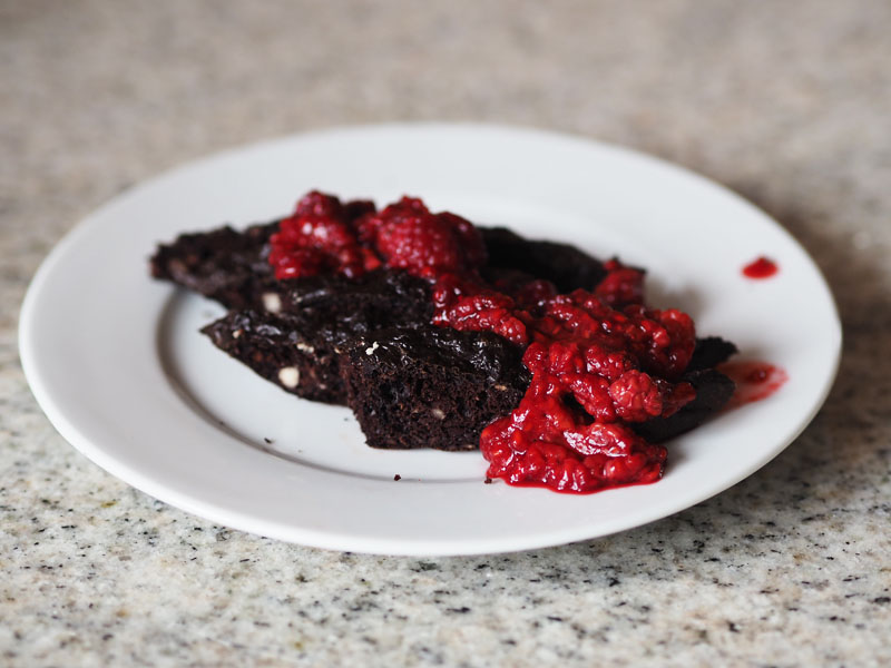 Nejlepší je ještě teplé a s horkýma malinama. Mražených malin mám vždycky doma zásobu, miluju je jíst jen tak místo zmrzliny a je to moje nejoblíbenější sladkost. Tady je teda dám do mikrovlnky a udělám z nich tak horký maliny, kterejma brownie poleju. Je to vlastně jediný doslazení, který používám a pokud jste víc na sladkou chuť a raw kakao vás neuspokojí, tak si do těsta přijejte jakýkoliv sladidlo dle vašeho uvážení nebo třeba při servírování polijte sirupem.