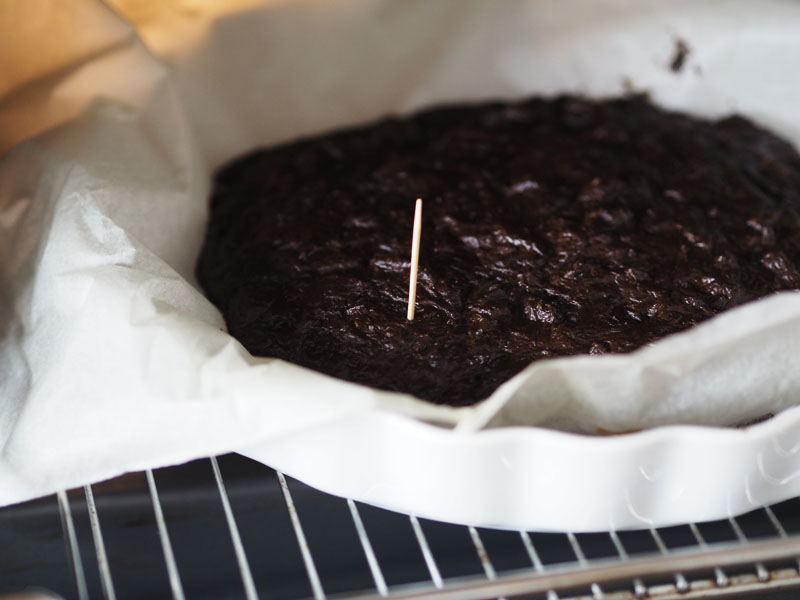 A pečeme na 200 stupňů zhruba 20 minut, stav kontrolujem párátkem a pokud už se na něj těsto nelepí, brownie je hotovo.