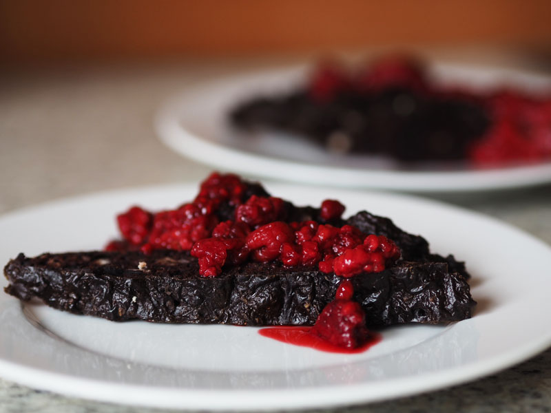 Nejlepší je ještě teplé a s horkýma malinama. Mražených malin mám vždycky doma zásobu, miluju je jíst jen tak místo zmrzliny a je to moje nejoblíbenější sladkost. Tady je teda dám do mikrovlnky a udělám z nich tak horký maliny, kterejma brownie poleju. Je to vlastně jediný doslazení, který používám a pokud jste víc na sladkou chuť a raw kakao vás neuspokojí, tak si do těsta přijejte jakýkoliv sladidlo dle vašeho uvážení nebo třeba při servírování polijte sirupem.