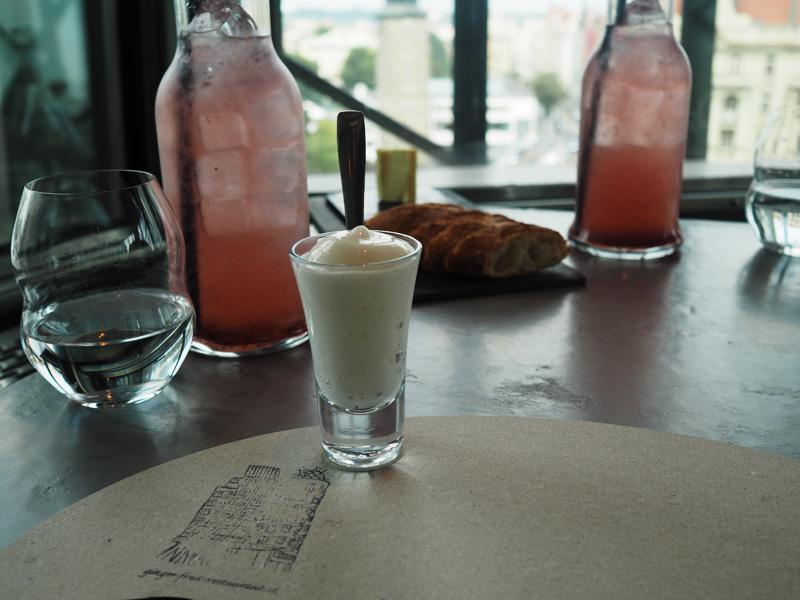 Ještě než nám na stole přistálo námi vybrané jídlo, dostali jsme opět pozornost šéfkuchaře (a na tyhle drobnosti já začínám být ujetá a okamžitě dávám plusový body navíc!) a to jablečnou pěnu s domácím pečivem, což se obojí suprově hodilo k našim malinovo-bazalkovým domácím limonádám.