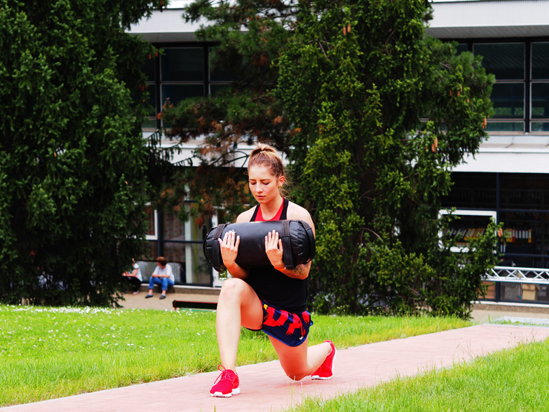 Na nohy a zadek jsou skvělý výpady. Tady dokonce z kopce a samozřejmě se zátěží. Pro mě jsou výpady jedním z nejnáročnějších cviků, ale taky nejvíc účinný, takže na ně určitě nezapomínejte. Myslete při nich na to, abyste udělali co nejdelší krok a procítili zadek.