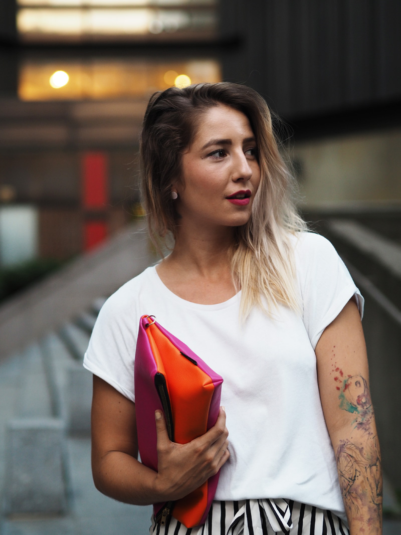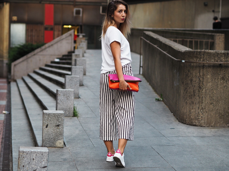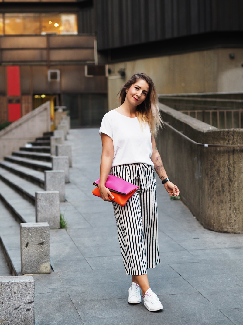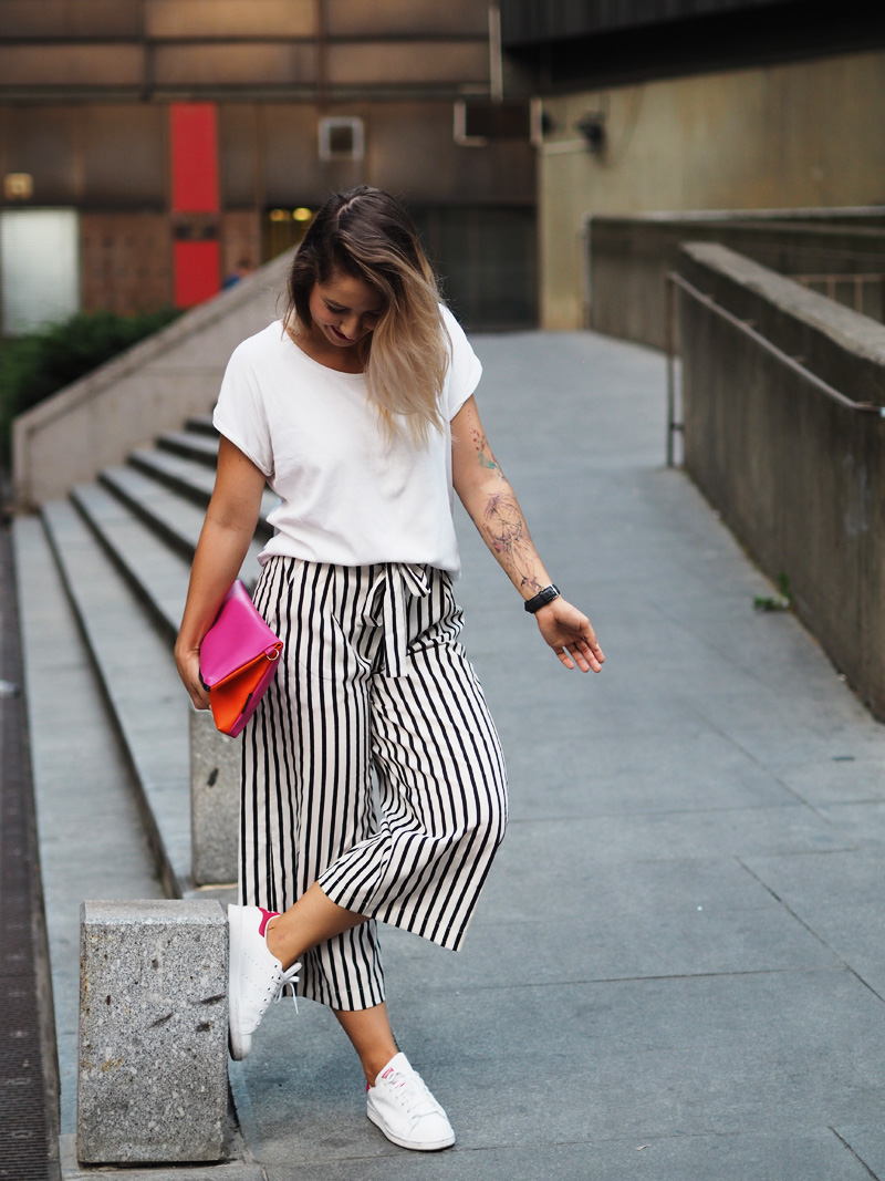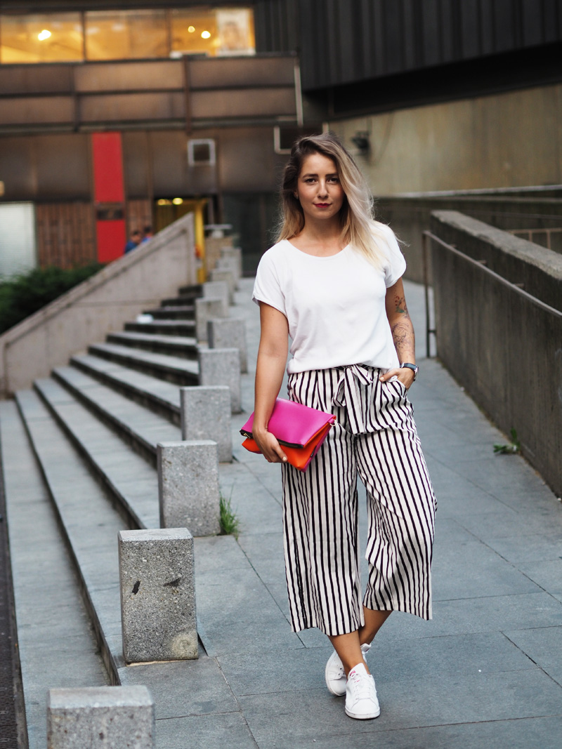 Vzhledem k tomu, jak strašnou čočku jsem dostala minule (TADY), když jsem publikovala outfit s těmahle kalhotama, rozhodně jsem dnes připravená na další dávku negativních reakcí, oproti minule jsem proti tomu obrněná i právě díky tomu, že s tím počítám. Můj kluk tyhle kalhoty taky nesnáší. A i já uznávám, že dvakrát lichotivou postavu nedělaj. Ale bavěj mě, fakt strašně moc, takže jsem využila pár posledních teplých dní a nějakej ten týden zpátky je zas vyvenčila. Místo crop topu jsem do nich ale zahrnula obyčejný bílý triko, přidala svý oblíbený Stany s růžovou patou, ke kterým jsem sladila i rtěnku a kabelku. Myslím si, že na fotkách je zas krásně vidět, jak spokojená jsem, což odráží přesně to, jak šťastný období teď mám. Čeká mě snad (ťuk ťuk ťuk) nová práce, za pár týdnů stěhování s drahým z garsonky do mnohem většího bytu, změna fitka, ještě pár výletů, naprosto skvělý kampaně a dokonce se i těším do školy. Bude to sice obrovská spousta změn po těch klidných příjemně proflákaných prázdninách, ale když na to člověk není sám, tak se není z čeho stresovat, ono si to nějak sedne a bude to paráda, věřím tomu a v tom je ta síla!