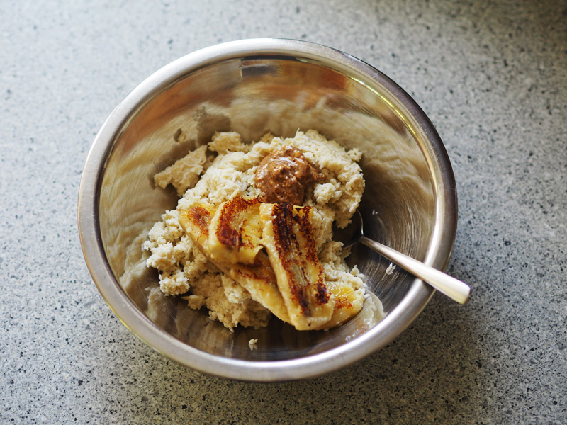 Ještě jedna dávná snídaně z paleo-inspired období. Kaše z vajíček, kokosovýho mlíka a kokosu s kešu máslem a opečeným banánem.