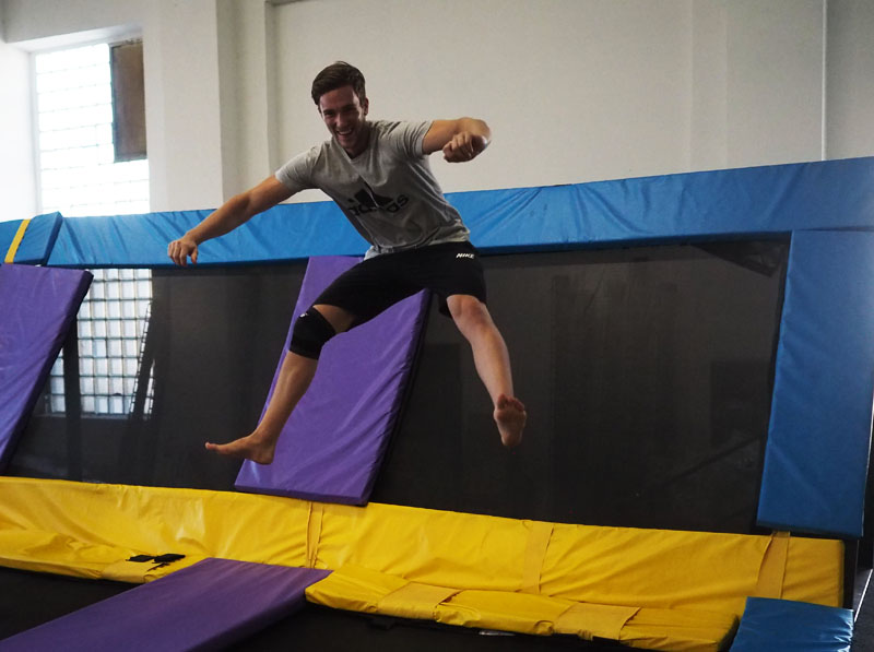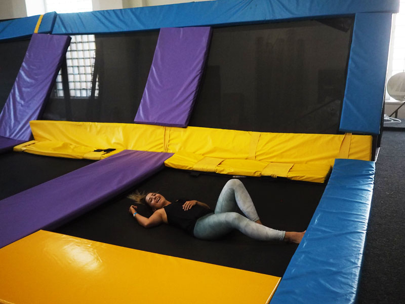 Včera jsme s přítelem vyrazili do JumpParku a já jsem z toho ještě dnes tak nadšená, že jsem se rozhodla se s Vámi o ten zážitek podělit a ukázat Vám pár vtipných fotek. Pokud se sem ale chodíte vyloženě pokoukat líbivýma kvalitníma fotkama, tak radši článek neotevírejte, tenhle je totiž trochu víc “real-life” a jde mi hlavně i to, abyste viděli, jaký štěstí a radost z těch fotek vyzařuje, protože si myslím, že v tomhle případě Vás to zaručeně naláká víc! Já jsem kdysi chodila na jumping ve formě lekcí s trenérkou a když jsem zjistila, že je v Praze tahle obří hala, kde se člověk dokonale vyřádí, několik týdnů jsem otravovala s tím, ať už tam jdem. Předevčírem večer jsem konečně sedla k rezervačnímu systému a na další den nám zamluvila jednu hodinu. Rezervace jsou mimochodem naprosto nutný, protože to má omezenou kapacitu, aby mohl skákat každej a nemuseli jste se s někým střídat, takže naslepo Vás tam prostě nepustěj. JumpPark najdete ve Strašnicích a za hodinu zaplatíte jako student 170,-. Přišlo mi to nejdřív jako dost peněz, ale zpětně uznávám, že to za to jednoznačně stojí, nepamatuju si, kdy jsem byla naposled tak moc vysmátá, unavená a pře-endorfinovaná. Co se týká organizace, tak kapacita lidí v naší hodině byla vyčerpaná a přitom jsme se s nikým nepletli a nikde nemuseli čekat. Hlavně v zadní rozlehlé částí je těch trampolín snad 50 vedle sebe. Vpředu jsou pak tři na skoky do molitanů (kam se mi jednou povedlo zajet tak hluboko, že jsem se nemohla vyhrabat ven a molitan vykašlávám ještě dnes! :D) a pak ještě prostor pro basket a vybíjenou na trampolínách. Rozhodně si teda vyberete a rozhodně si taky během tý hodiny budete muset chvíli odpočnout. Je to slušná makačka, já se zezačátku docela bála a bolely mě kolena, jak to bylo pro mě nezvyklý, ale zhruba po čtvrt hodině už jsem se aklimatizovala a skákala jak ďas. A padala. A padala. A padala :D. Protože mi pak vždycky najednou vypověděly nohy a šla jsem k zemi.