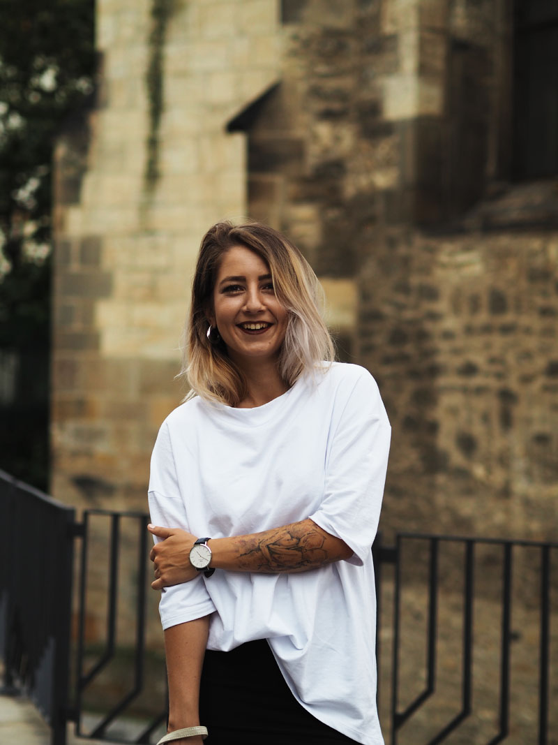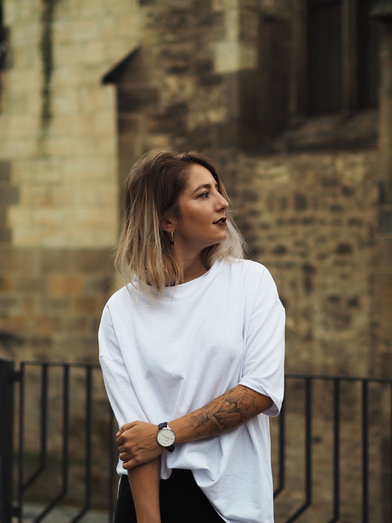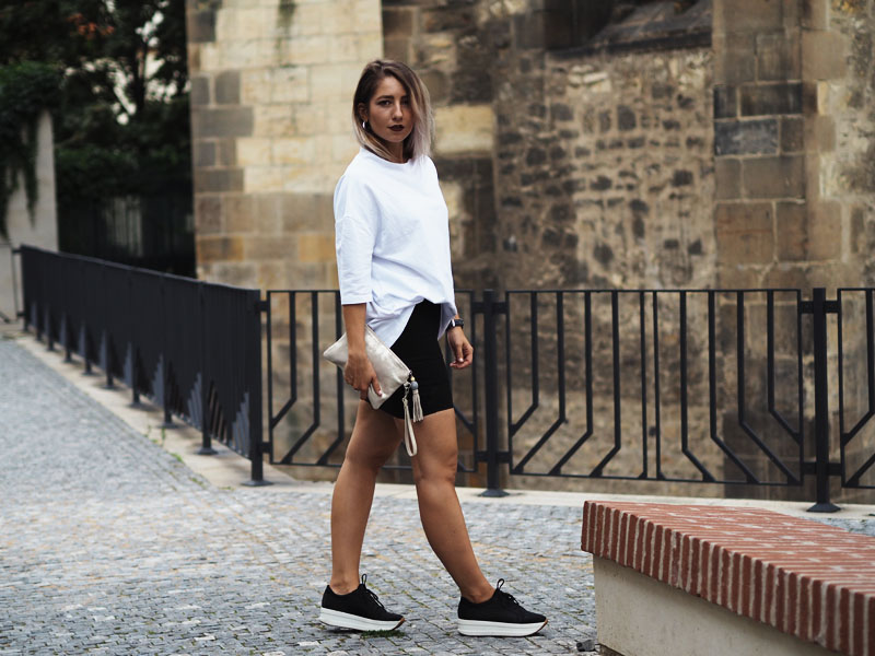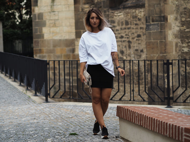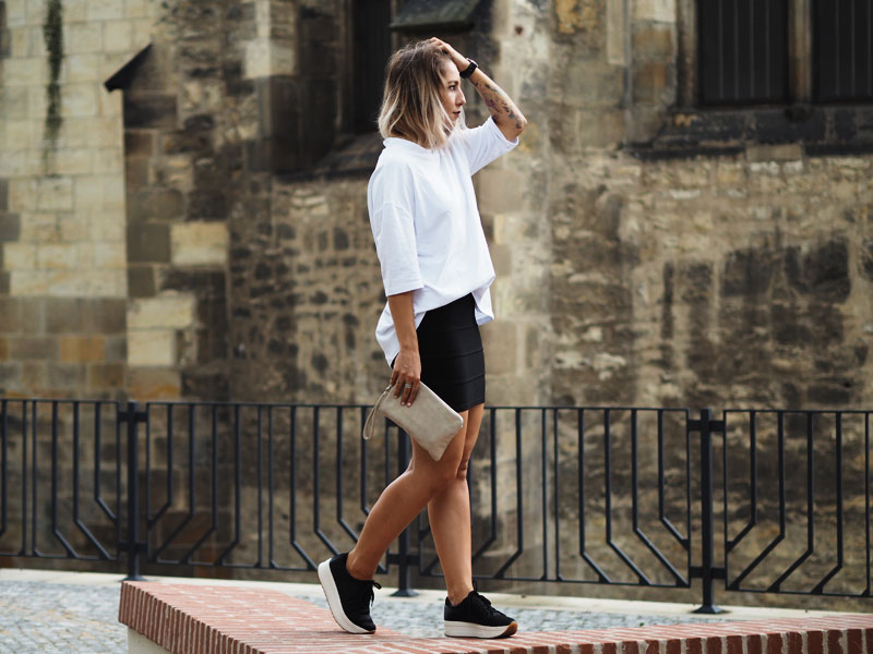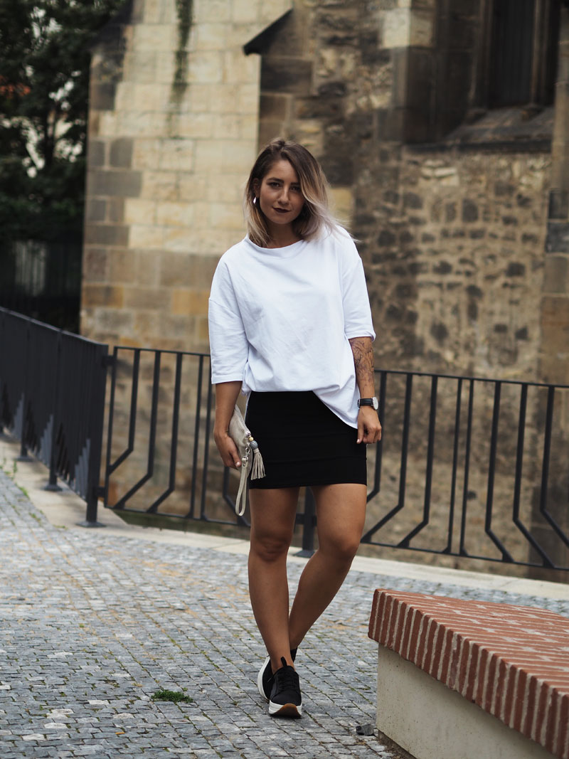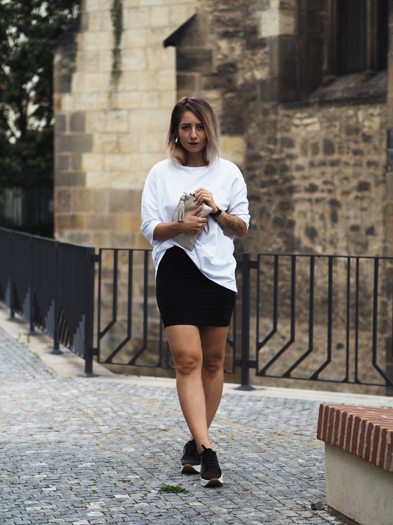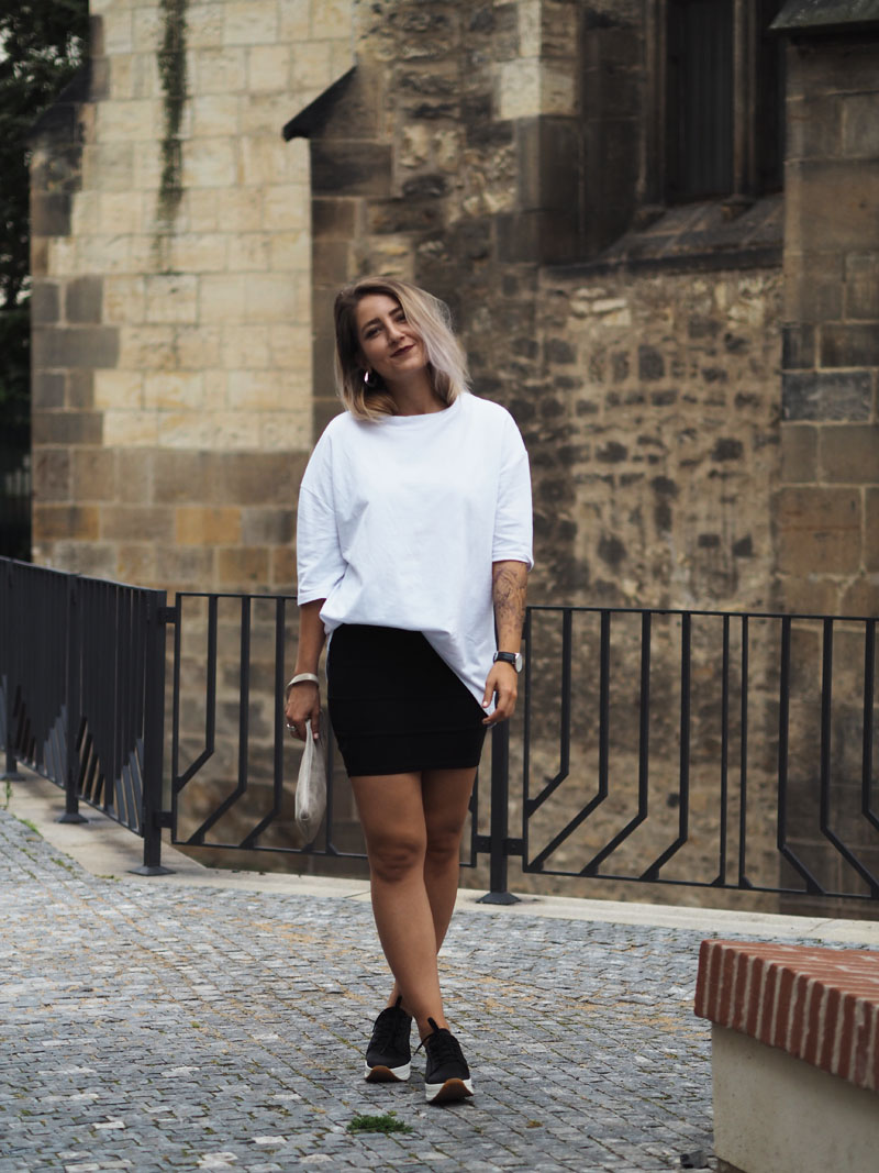 Fashion week je za námi a ze všech online kanálů blogerek, časopisů a webu sledujících módu a české designéry se valí kvanta fotek, videí a dojmů. Vím, že když jsem toho loni absolutně nebyla součástí, přišlo mi to přehnaný a otravovalo mě to. Letos si ale hrozně užívám, co za outfity lidi ukazujou, jak hodnotěj jednotlivý přehlídky a celý to dění okolo. Poprvé jsem totiž měla díky Olympusu možnost se podívat všude, kde se mi zachtělo. Naplánovala jsem si tak účast na dvou dnech a upřímně řečeno – nakonec jsem myslela, že zůstanu jen v posteli a na všechno se vykašlu. Posledních pár dnů se totiž moje nálada pohybuje na bodu mrazu aniž bych tušila čím to je, což mě vytáčí ještě víc, protože takový věci se mi normálně nedějou. Každopádně určitě znáte tu náladu, kdy štvete sami sebe, štvou Vás všichni okolo a nejradši byste trávili celý dny u seriálů v posteli (btw, Stranger Things jsme s Kubou zvládli shlédnout za 1 den a je to totální pecka :D) a poslední na co máte náladu, je se vystajlovat na akci, kde jste nikdy nebyli a kde to bude jeden módní guru vedle druhýho. Usoudila jsem ale, že si takovou příležitost nemůžu nechat ujít a tak jsme s přítelem vyrazili. Samozřejmě pršelo a když jsme schovaný pod střechou nakukovali zpoza rohu ke vchodu do garáží Kotvy, kde se přehlídky konaly, zůstala jsem tam stát několik minut uplně zkoprnělá a rozhozená. Jsem člověk, co fakt blbě snáší nový situace, natož ty, ve kterejch se necejtí dobře a je celej nejistej. A situace, kdy máte vejít mezi lidi, co vypadaj, jak když vyskočili ze zahraničních módních magazínů (nebo taky třeba z blázince), je rozhodně jedna z nich. Uvolnit jsem se dokázala až po přehlídce, když jsme dofocovali tenhle outfit a před náma byl jen už raw dort a pak ta postel se seriálama. Každopádně další den jsem si užila o sto procent líp, takže šlo fakt jen o ten strach z neznáma a o to, že jsem prostě někdy až moc nerváček. O dalším dni Vám ale povím až příště, teď ještě rychle k outfitu – na instagramu jste mi chválili triko, to mám od Kuby ze Zary a jsem z něj naprosto odvařená, k němu jsem zvolila úzkou mini, zlatý kožený Toms psaníčko, po který jsem koukala už půl roku a Vagabondy, který na mě asi uvidíte teď pořád, protože jsou stejně pohodlný jako jsou cool! Tak co vy na to?