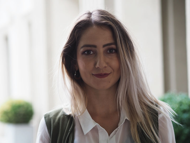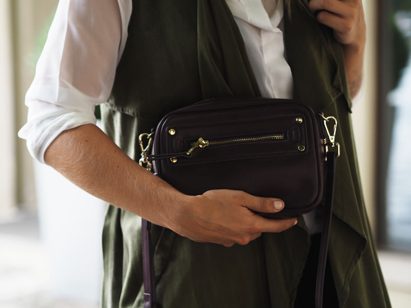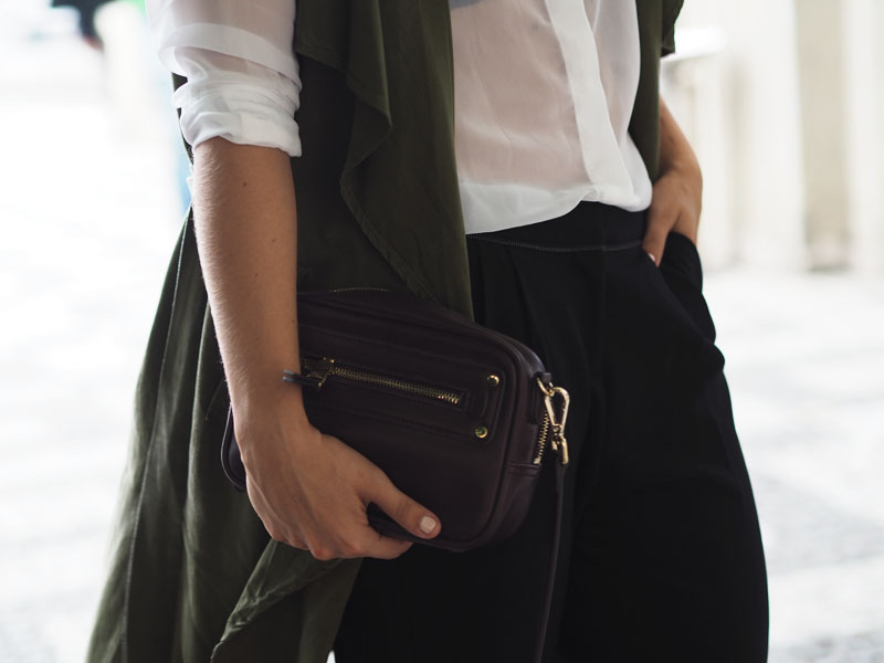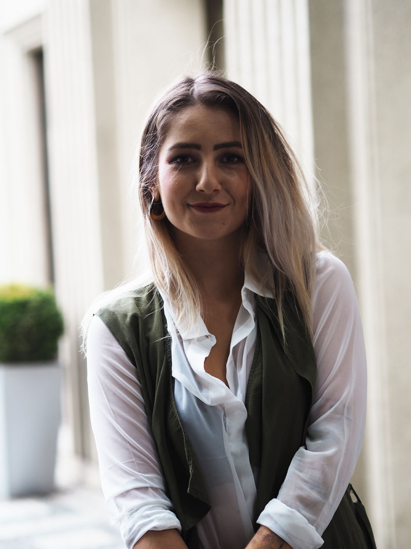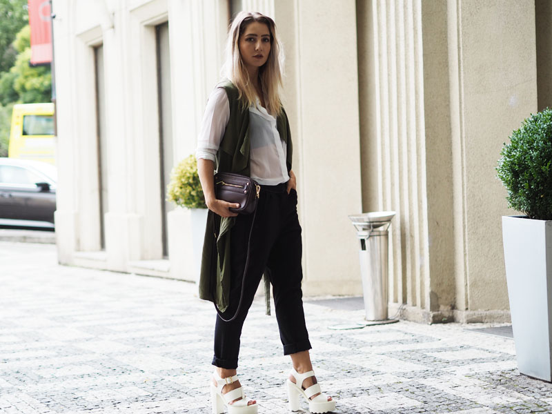 Málem bych zapomněla, že tady mám ještě nachystané fotky mýho druhýho outfitu z fashion weeku. Přesně jsem věděla, že si tyhle boty musím vzít, protože v běžný dny na ně uplně odvahu nemám, jsou přece jen trochu šílený. Jsou ale díky velký platformě super pohodlný a zvládla jsem v nich i běhat, protože samozřejmě zase pršelo – to je totiž jistotka, když máte podpatky a po dlouhý době do rovna vyžehlený vlasy. K botám jsem zvolila volnější společenský kalhoty, průhlednou bílou košili s dlouhou zelenou vestou a doladila to zlatými detaily a přidala oblíbenou mini-kabelku z Bati, která mě tenkrát stála asi dvě stovky a nechápu, proč ji nemám ve víc barvách, protože ač je maličká, dám do ní v pohodě i foťák.